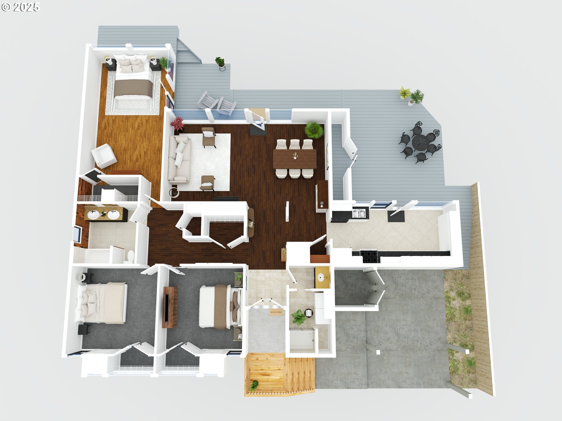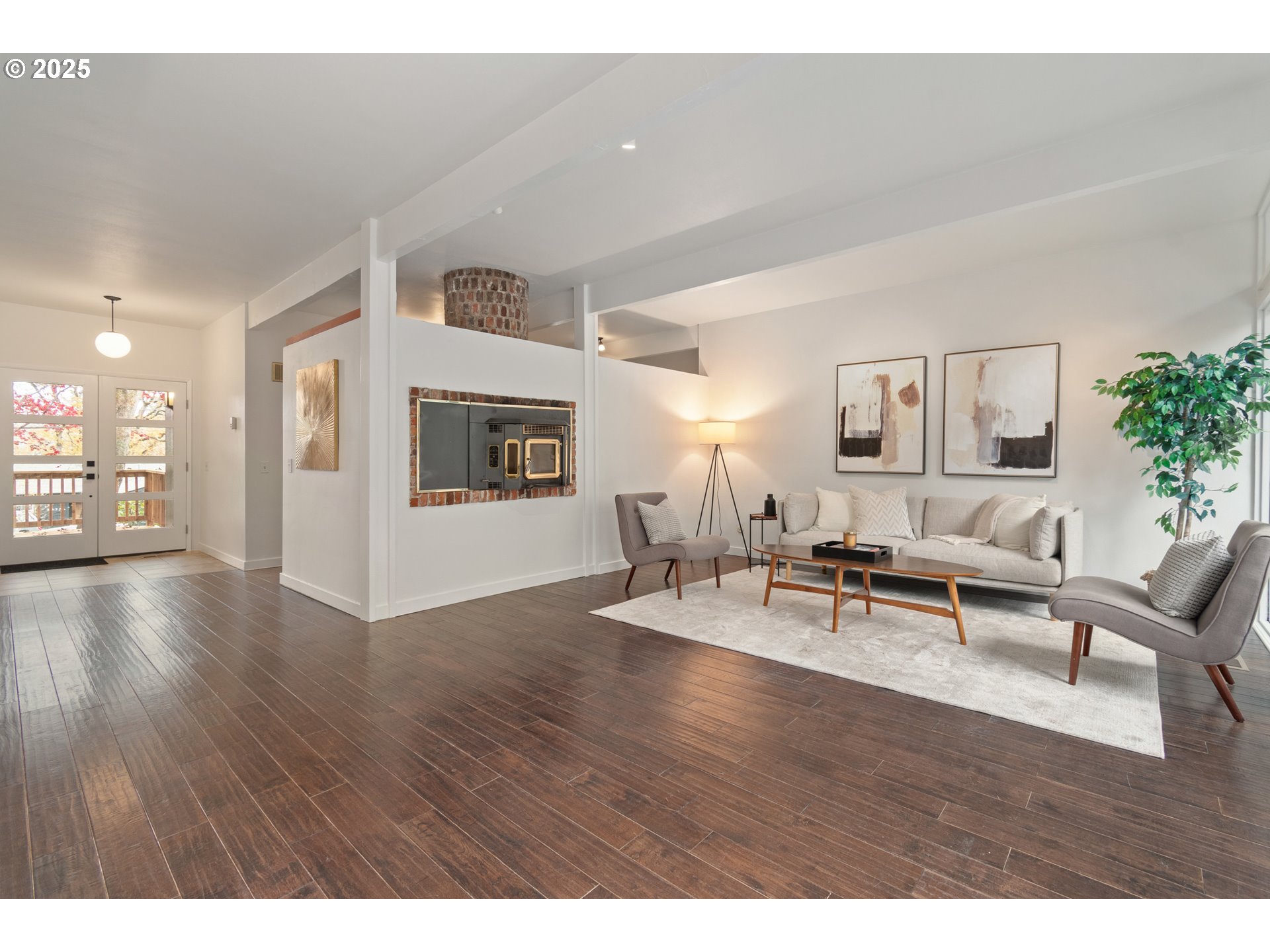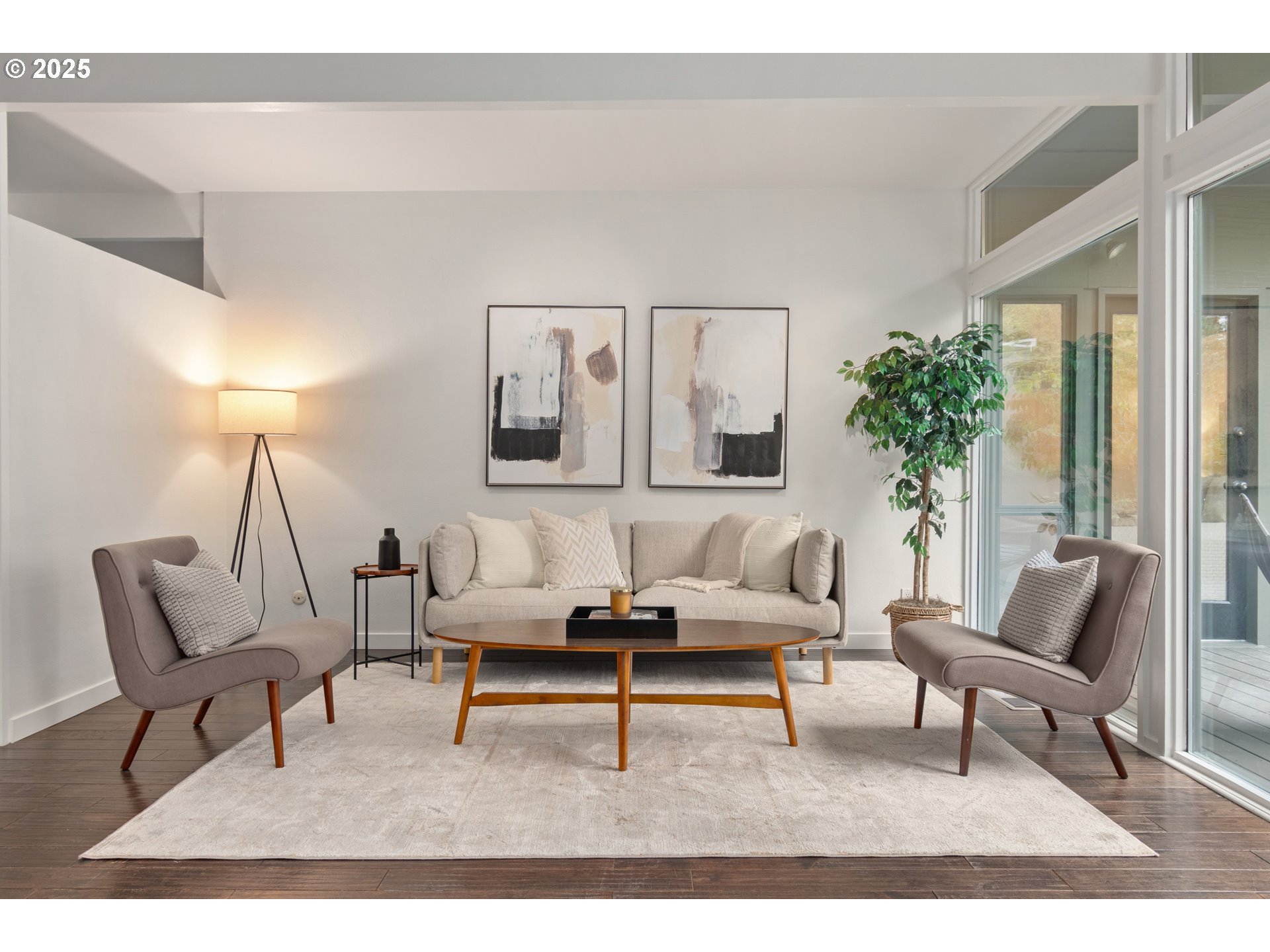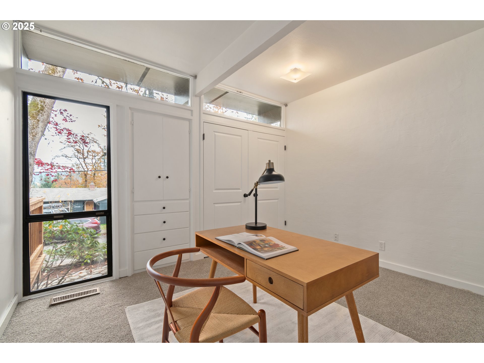 Open houses Sat 11/15 & Sun 11/16 from 2-4pm! Welcome to a bright & inviting Mid-Mod in the desirable South Hills of Eugene. This 3-bed, 2-bath, 1-level home features 1,800 sqft of stylish living space that embraces classic mid-century elements like clean lines, floor-to-ceiling windows, high ceilings & a connection to nature. Sunlight fills the open living and dining areas, which include engineered hardwood floors and a cozy pellet stove. The kitchen features granite countertops, a gas range, full-wall pantry, and stainless steel appliances — all included. The spacious primary bedroom offers glass doors to the backyard and a cedar-lined walk-in closet. Both additional bedrooms have brand-new carpet and built-in storage. The 2 full baths include one with a soaking tub and double vanity, and another with a walk-in shower and laundry area. Fresh paint inside & outside, new fencing, new front porch, new front door and newly stained back deck complete the look. Easy maintenance yard embraces the PNW vibes and you'll appreciate the carport and ample storage. It's your chance to embrace indoor/outdoor living and minimalist architectural design, all in one of the most desirable neighborhoods in Eugene.