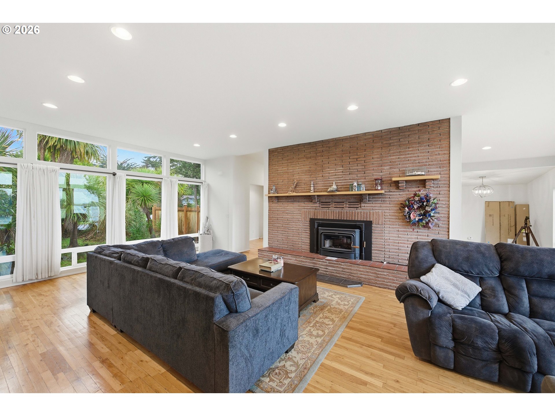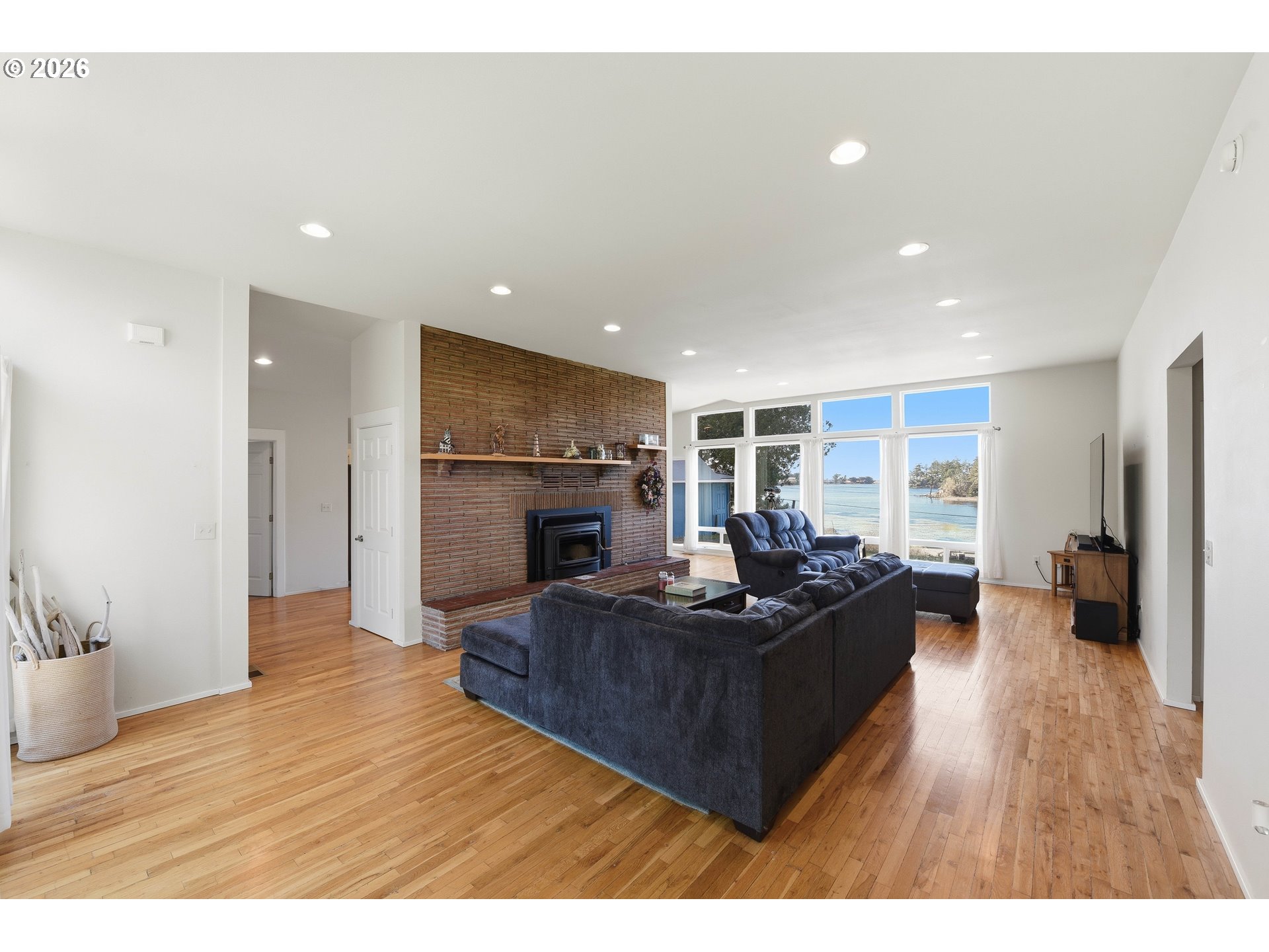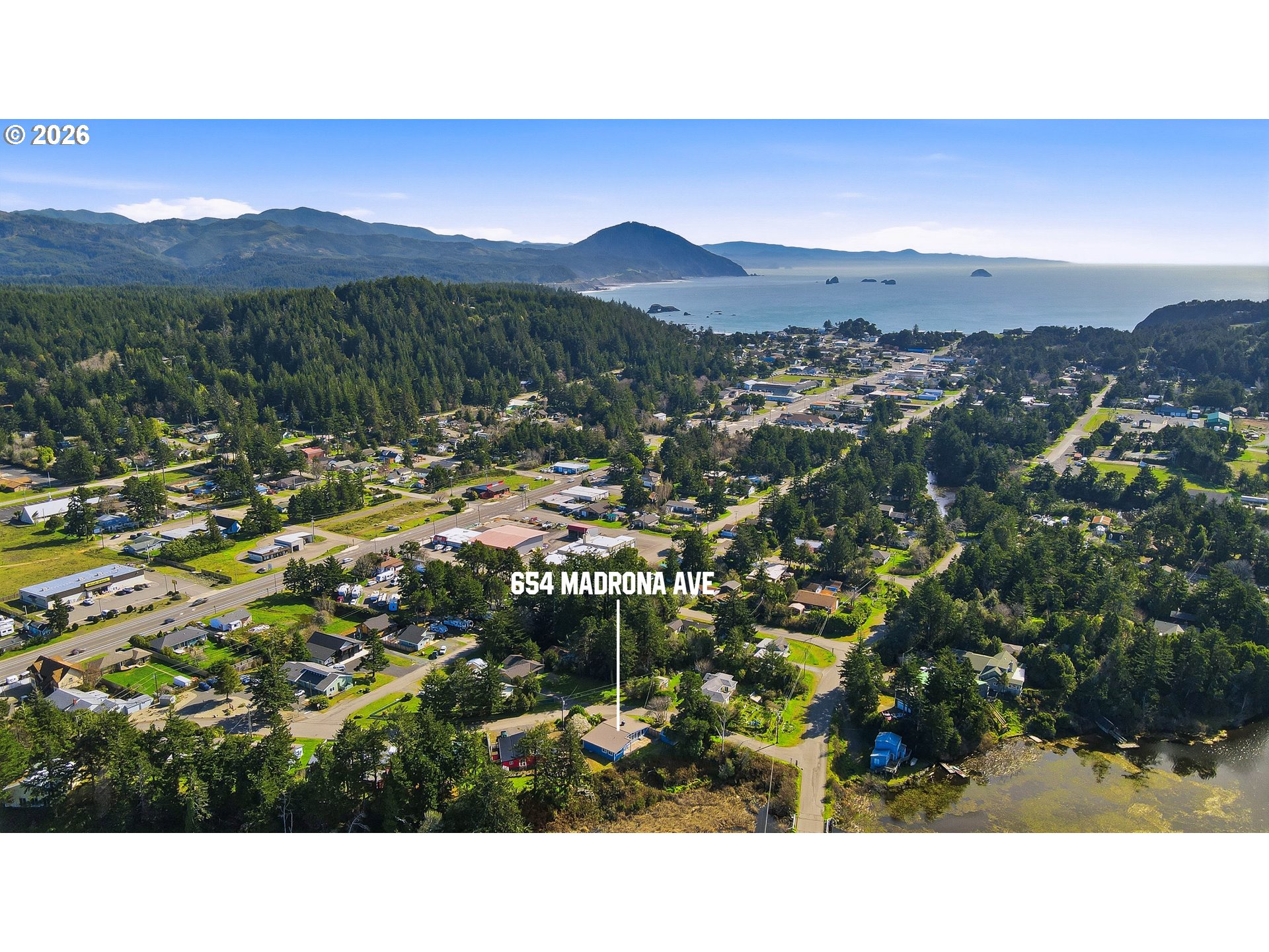 Perched on a bluff above Garrison Lake with a deep sightline out toward the Pacific Ocean, this remodeled, mid-century modern home is all about the view—especially at sunset. A wall of west-facing windows frames the water from the main living area, while additional windows on the opposite side keep the home naturally bright throughout the day. The living space features high ceilings, hardwood floors, and a striking masonry fireplace with a new Blaze King wood-stove insert for cozy coastal evenings. The modern kitchen offers updated cabinetry and a functional layout, and the views carry through to the primary bedroom and bath. Outside, enjoy a patio/deck overlooking the lake, plus Port Orford cedar privacy fencing front and back. Recent improvements include exterior paint, updated lighting, a newer Samsung oven, and Samsung washer. Previously operated as a vacation rental (buyer to verify intended use). Minutes to Battle Rock Park, the Port of Port Orford (marina/docks), Port Orford Heads State Park, Cape Blanco State Park & Lighthouse, and Humbug Mountain State Park—plus beaches, trails, dining, and medical clinics nearby.