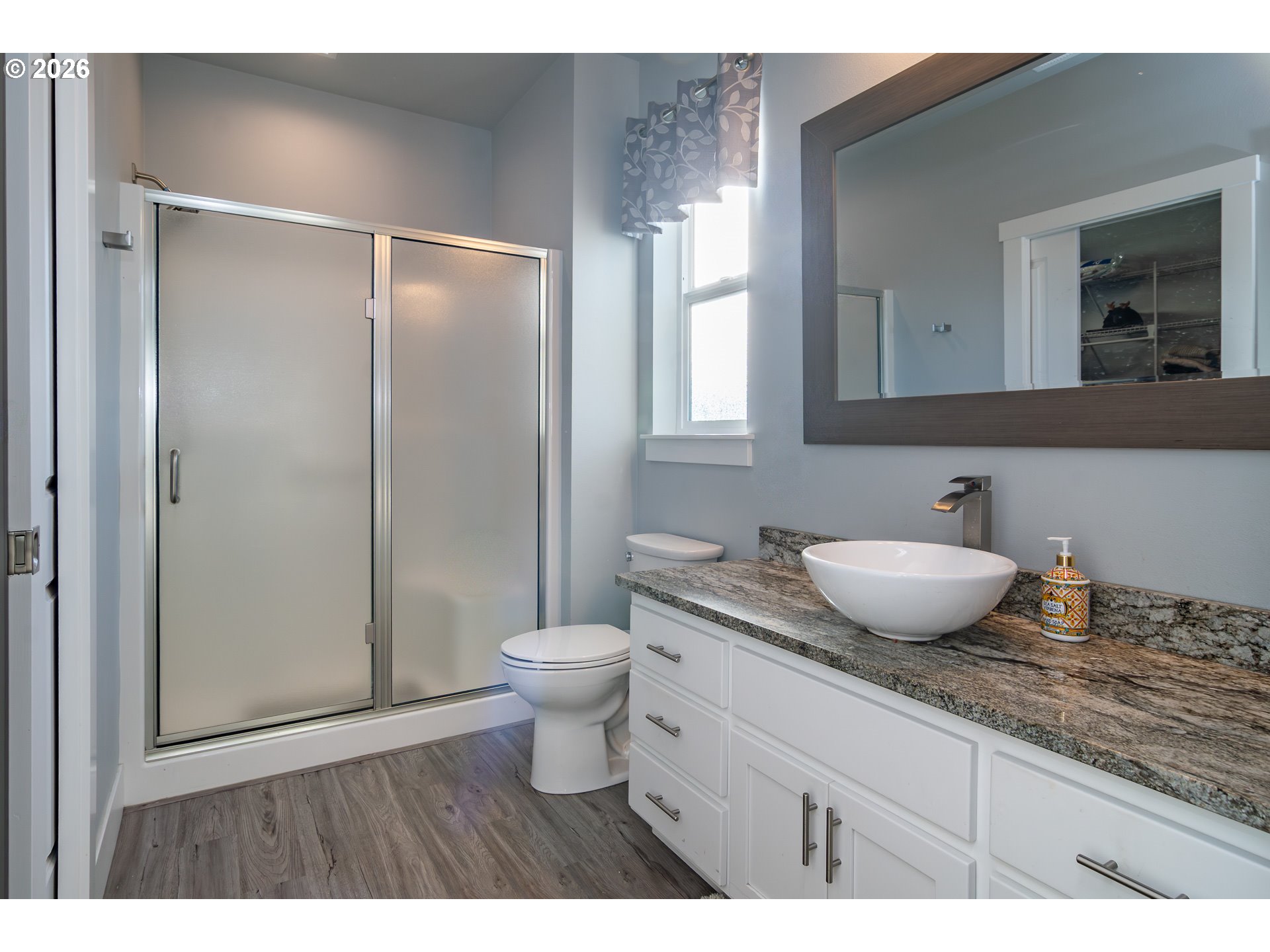 Experience gorgeous sunset views overlooking the 17th hole and tranquil ponds of Oak Hills Golf Course in Sutherlin in this stunning custom-built home located in the gated Fairway Estates community. Built in 2018, this beautifully designed 3-bedroom, 2-bath home features a half-step entry and thoughtful accessibility throughout. Enjoy an open-concept floor plan with high ceilings and luxury vinyl plank flooring. The spacious living room showcases floor-to-ceiling windows capturing breathtaking mountain and golf course views, plus a cozy gas fireplace for year-round comfort. The large kitchen is equipped with stainless steel appliances, a gas cooking stove, large eating bar, and gorgeous granite countertops in the kitchen, bathrooms, and laundry room. Refrigerator included. Step outside through the dining room sliding glass door to a covered deck—perfect for entertaining or relaxing while taking in the fairway and water features. Situated on a quiet cul-de-sac, this home also offers a fenced dog run area for your pets. Located in a secure, gated golf course community with scenic ponds and water features. For more information about the community, visit FairwayEstatesOregon.com