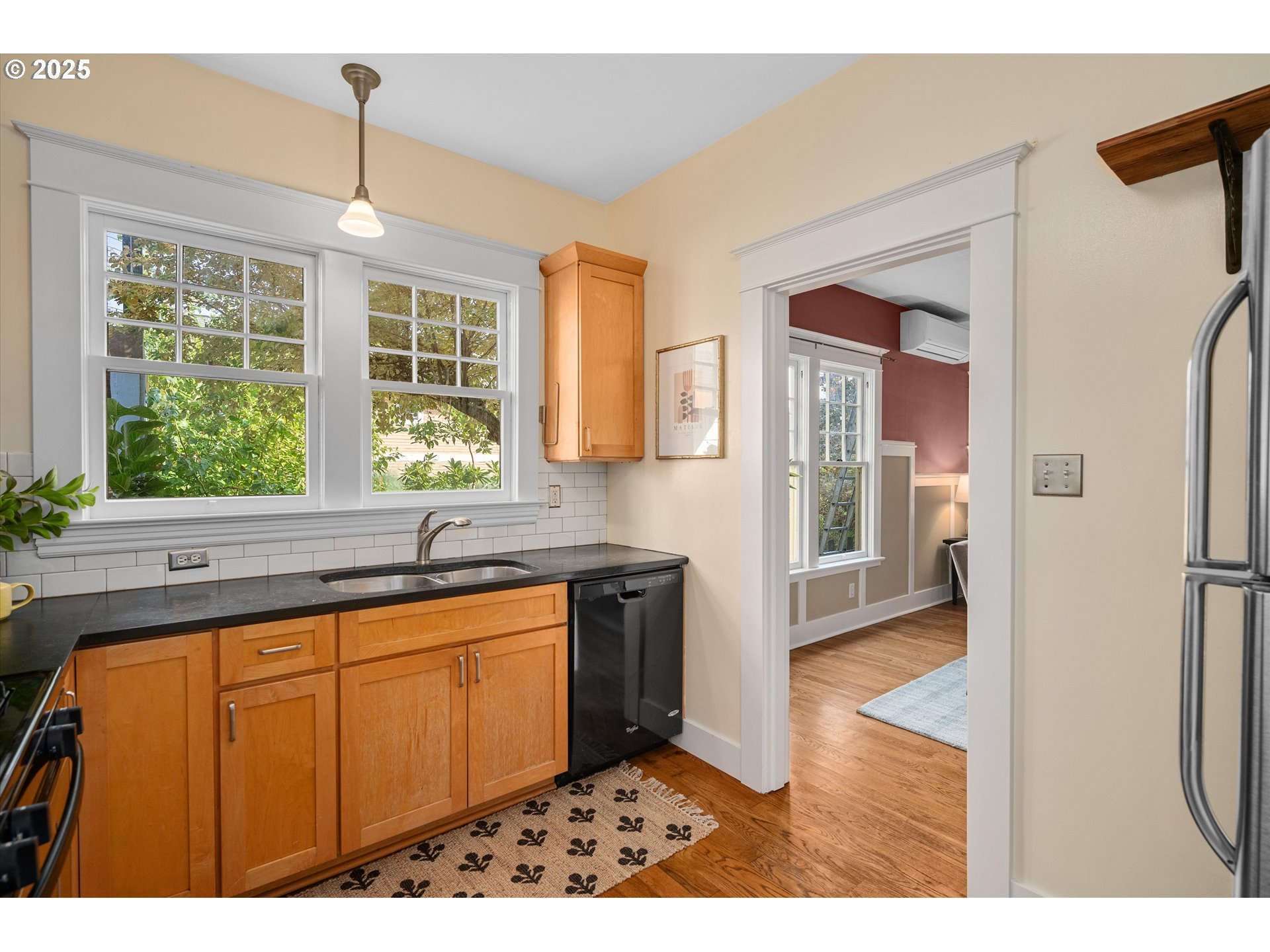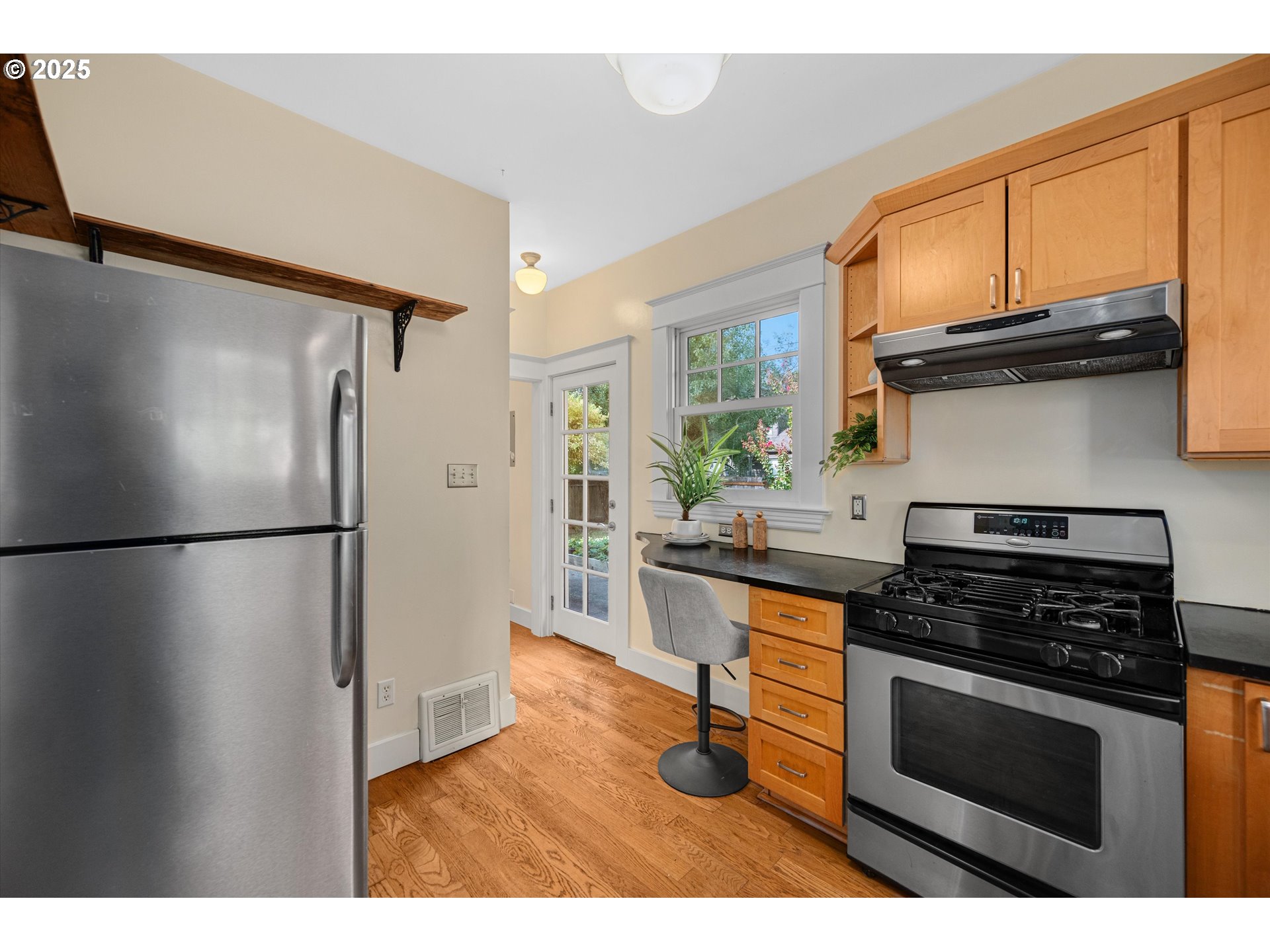 Timeless Charm Meets Modern Comfort in North Portland’s Overlook Neighborhood! Welcome to this beautifully preserved 1912 bungalow, where classic Craftsman character blends seamlessly with thoughtful modern updates. Nestled on a quiet street in the coveted Overlook area, this home offers three spacious bedrooms and two full baths-perfect for everyday living and elevated entertaining. Step inside to discover beautiful hardwood floors, period-style lighting, and a warm designer-inspired color palette. A light-filled, spacious living room creates a welcoming atmosphere, while the formal dining room sets the stage for memorable gatherings. The fully remodeled kitchen features sleek black slate countertops, new cabinetry, a gas range, and a sizable dedicated pantry. Upstairs, a versatile bonus room makes an ideal home office, nursery, or creative studio. Both bathrooms have been tastefully updated to complement the home’s historic character. The full unfinished basement with a smooth concrete floor, laundry area, and generous ceiling height—offers endless possibilities for a gym, private studio, or additional living space. Outside, enjoy a private landscaped backyard with mature plantings, a spacious tool shed, and a charming front porch—perfect for relaxing on quiet evenings. Updates include Solar panels, additional insulation, automatic driveway gate, newer HVAC system, restored original double-hung windows, newer dishwasher and refrigerator, all-new interior and exterior paint, all-new window and door trim pain, and new tile in the main-level bathroom. With exceptional walkability to shops, restaurants, parks, bars, and public transit—and just minutes from downtown—this home captures the best of Portland living. [Home Energy Score = 5. HES Report at https://rpt.greenbuildingregistry.com/hes/OR10241907]
