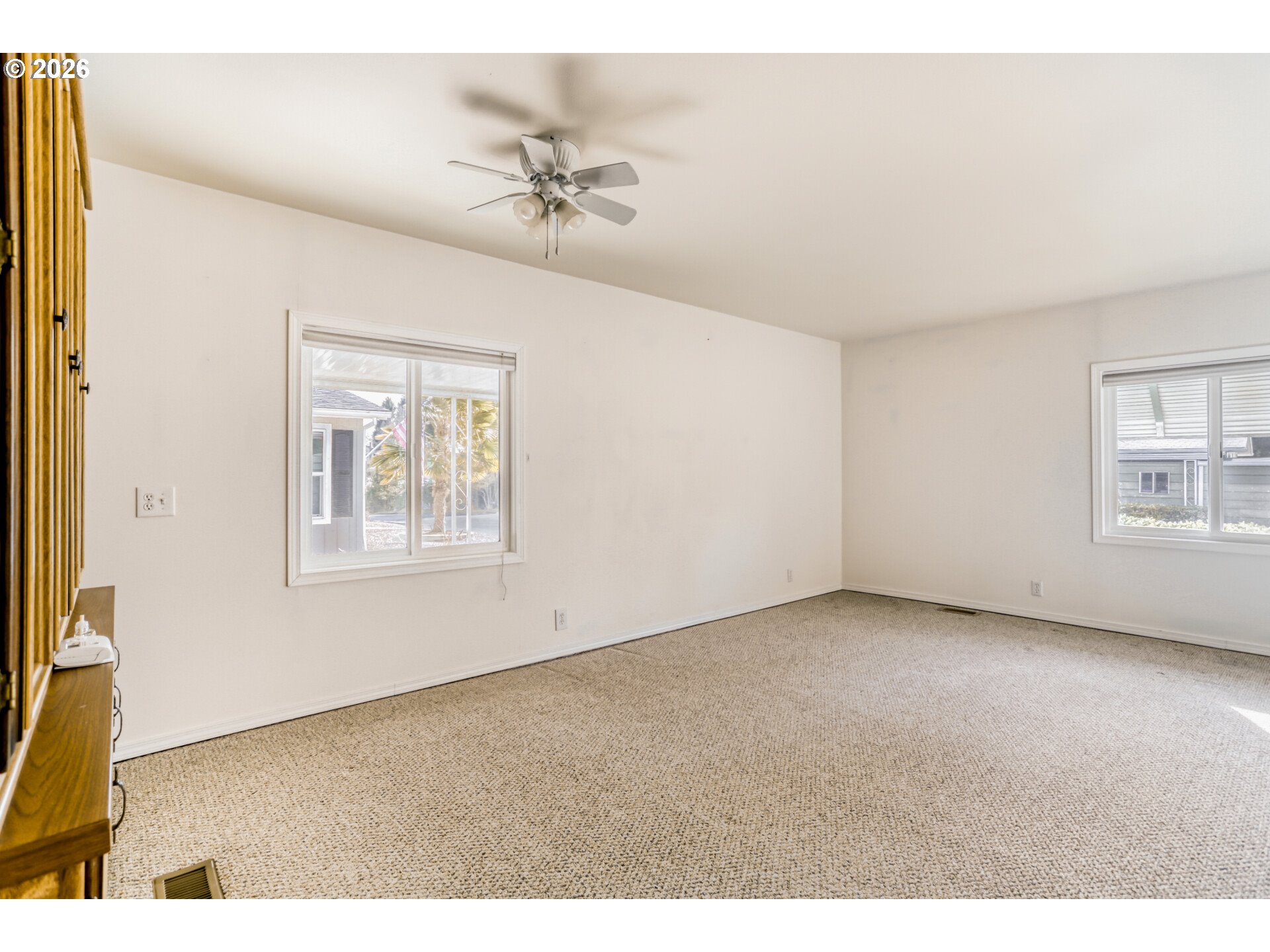 NEIGHBORHOOD OPEN HOUSE 12-3pm, Sat 1/24/26. This welcoming home is both cozy and roomy. Small ramp at the back door helps you enter the spacious laundry room from an extra long carport. Upright freezer and laundry pair stay, and there’s still plenty of room for a desk at the window. Jack and Jill bath, completely redone with ample storage space and walk-in shower, leads to the second bedroom. Closets run the entire width of both bedrooms. Huge primary has ensuite bath, sparkling from its own makeover and includes both tub and shower. Family room has beautiful, wood-burning, stone fireplace with blower. An extra deep storage closet is a big plus! Slider door exits to the covered patio. A Low-counter peninsula is the only divider between family room and bright & generous kitchen with stainless steel frig & range, and fabulous lighted pantry. No dishwasher, but plumbing is in place for it. Formal dining area includes an elegant hutch and shares the space with a large living room bathed in light from windows all around. Covered patio area outside the front door, bordered with flowering bushes and arborvitae for privacy. Expansive raised bed out back and shed with electricity at the end of the carport. Sale contingent on park approval. Park rent $1300/mo. Pet friendly, Clubhouse, 2 common-area parks, seasonal pool, exercise room and library all included.