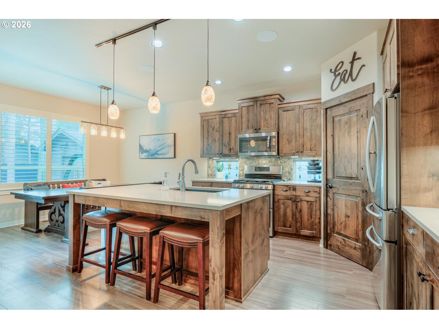 Crescent Creek living at its best! This well-maintained single-story home sits on a larger lot and features a triple-car garage with an epoxy floor and built-in storage. The open floor plan, vaulted ceilings, fireplace, and well-kept finishes create a warm, welcoming ambiance. Sonos in-ceiling speakers and Lutron lighting elevate the kitchen space. The primary suite offers a luxurious retreat with a dual vanity, walk-in closet, soaking tub, and shower. The backyard is a private escape, featuring a covered deck with lighting and a TV, plus plenty of room for outdoor furniture. The fenced and gated yard also includes a storage shed and garden spaces, perfect for relaxing or gardening. Enjoy a vibrant community with a clubhouse, sports court, community spaces, and paved walking trails. This home offers the perfect blend of comfort, style, and community living.