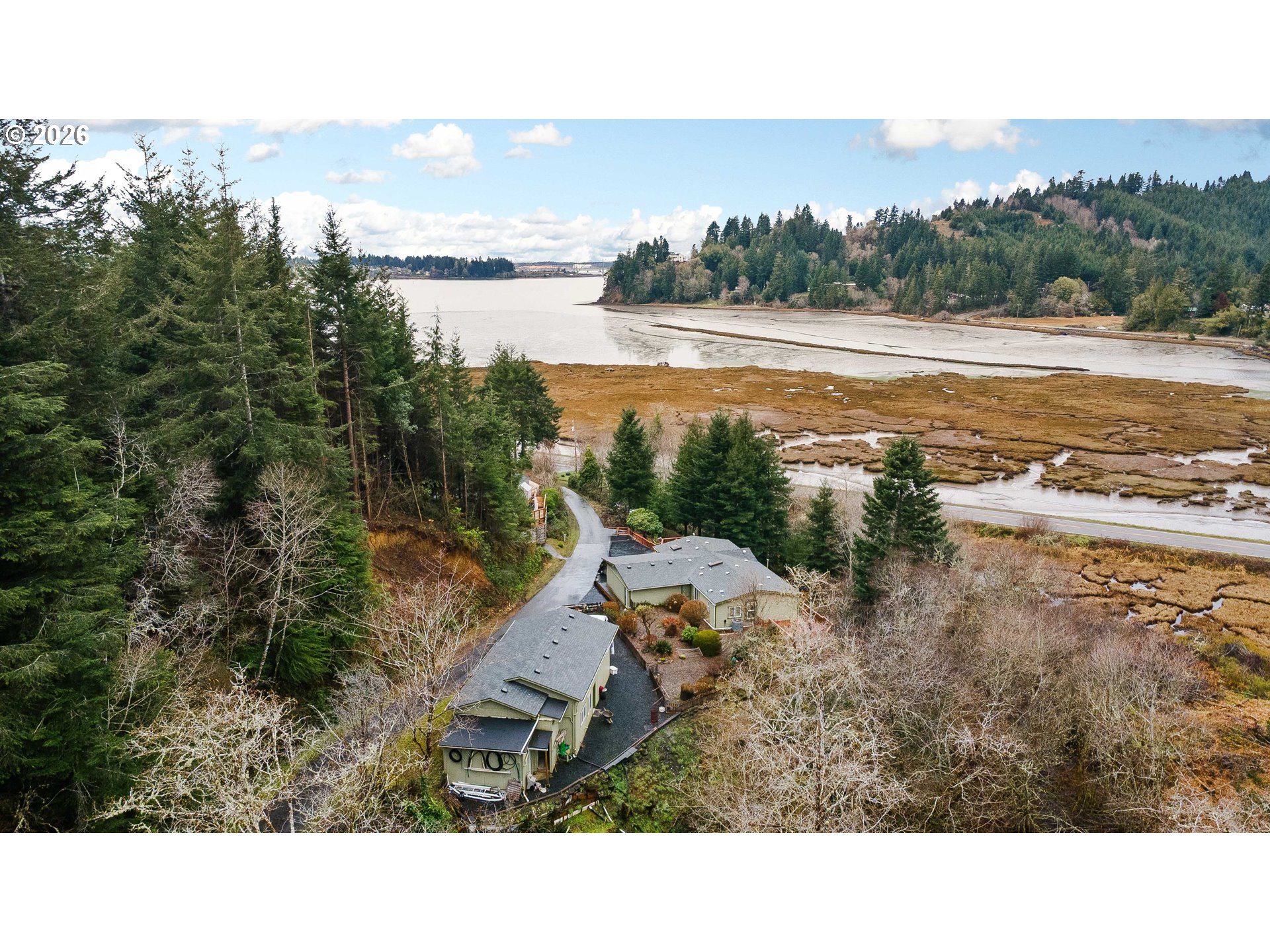 Priced to sell and DEFINITELY A MUST SEE BEAUTIFUL HOME with BREATHTAKING VIEWS! This beautifully maintained 1,512 sq. ft. double-wide manufactured home offers two bedrooms with an easy conversion to a third bedroom or den (currently used as an office). Pergo, tile, and laminate flooring are featured throughout the home, complemented by high ceilings, skylights and a welcoming covered entryway. The spacious primary suite includes a walk-in closet, garden tub, walk-in shower, and private access to the wraparound deck ideal for taking in the stunning views of the North Bend Bridge and the beautiful Bay along with a view of Kentuck Inlet. The kitchen is thoughtfully designed with granite countertops, a double oven, built-in microwave, ample pantry space along a charming coffee nook perfect for enjoying your morning beverage. Step outside to the expansive wraparound deck, perfect for sunrise coffee or evening sunsets and enjoy the fully fenced backyard offering privacy and outdoor space. This property also features an impressive approximately 24’ x 36’ detached 2 bay shop with power, concrete flooring and an approximately 15-foot-high garage door ideal for RV parking, additional vehicles, or hobby use along with the 2 car garage attached to the home. Lower yard is perfect for family gatherings. Build a fire and enjoy! With stunning views from the deck in both the mornings and evenings, this home delivers comfort, functionality and scenery in one exceptional package.