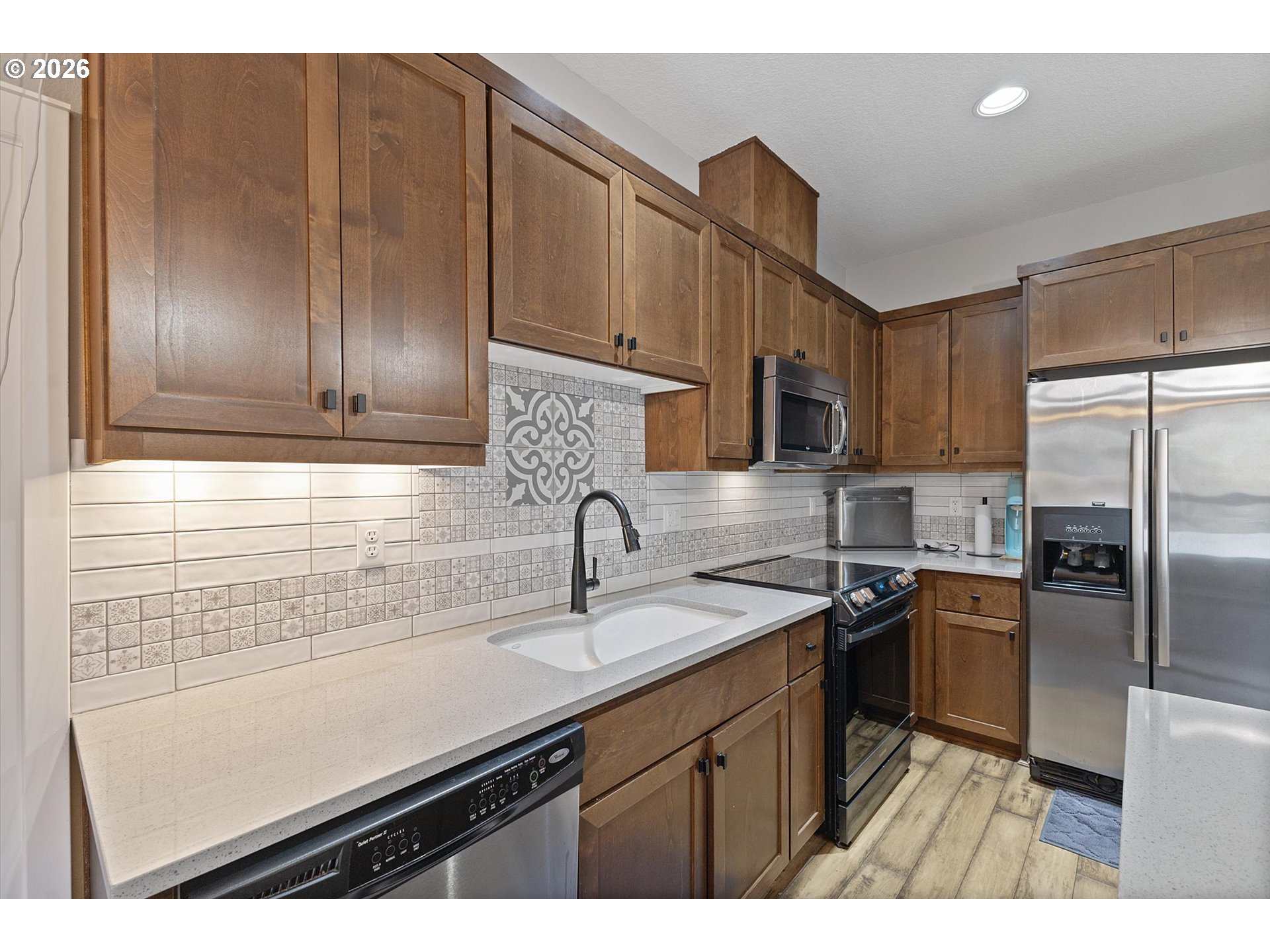 Low maintenance living meets luxury! This beautifully maintained 3-bedroom, 2-bath home offers 1,523 square feet of comfortable, light-filled living space with high end finishes. The kitchen flows seamlessly into the dining and living space, creating a warm and welcoming atmosphere. The primary suite offers a private retreat with an en-suite bathroom, while two additional bedrooms provide flexibility for guests, a home office, or hobbies. This home backs to a treed green space with a private deck and stairs leading to a FULLY FENCED backyard space. HOA includes a 27-hole par-3 golf course, a 36-hole putt-putt course, and a clubhouse with a fully equipped gym and of course ALL exterior maintenance of the home! Enjoy low maintenance resort style living while still being conveniently located to Clackamas Town Center & I-205. Schedule a private showing before it's gone!