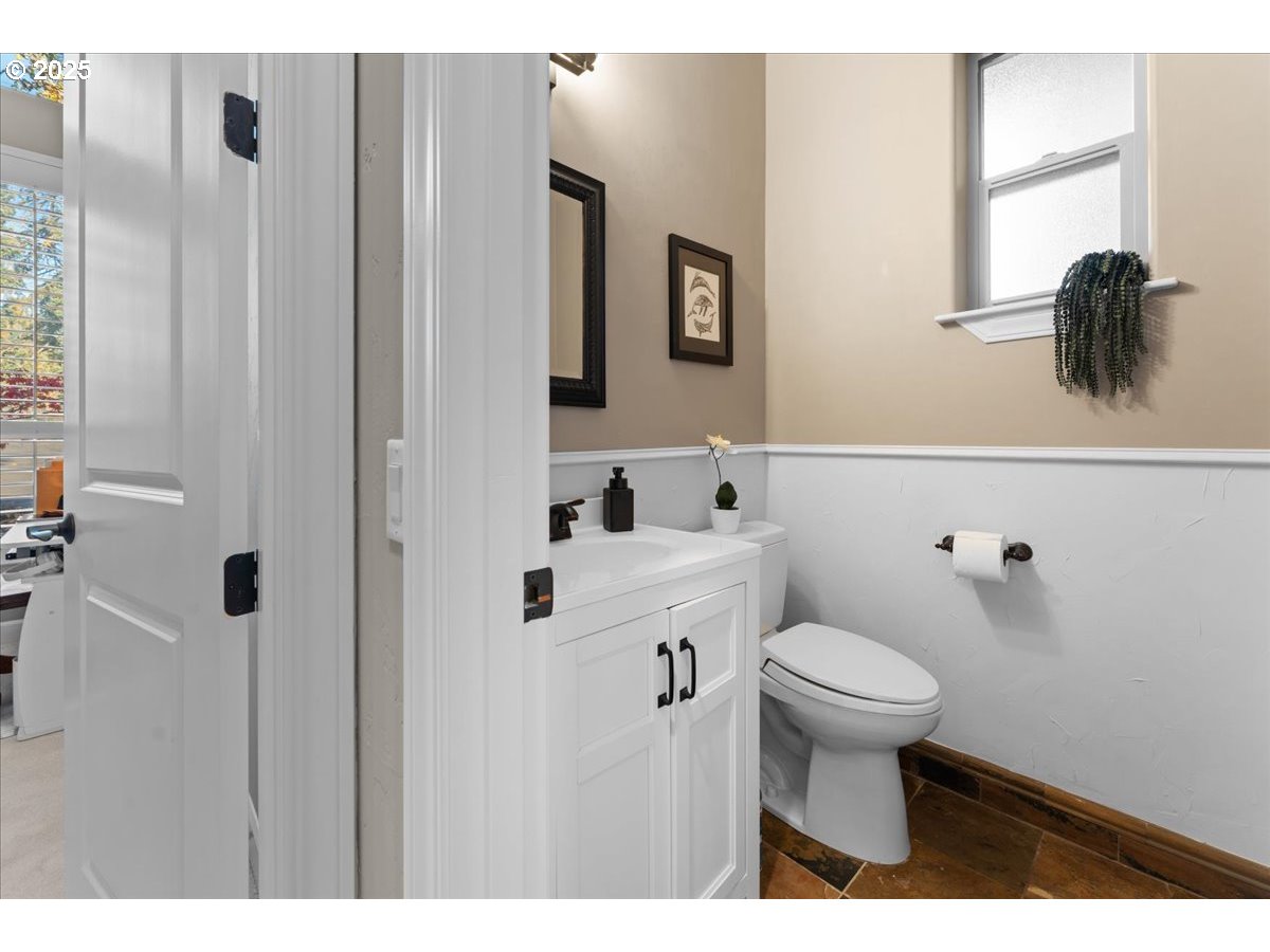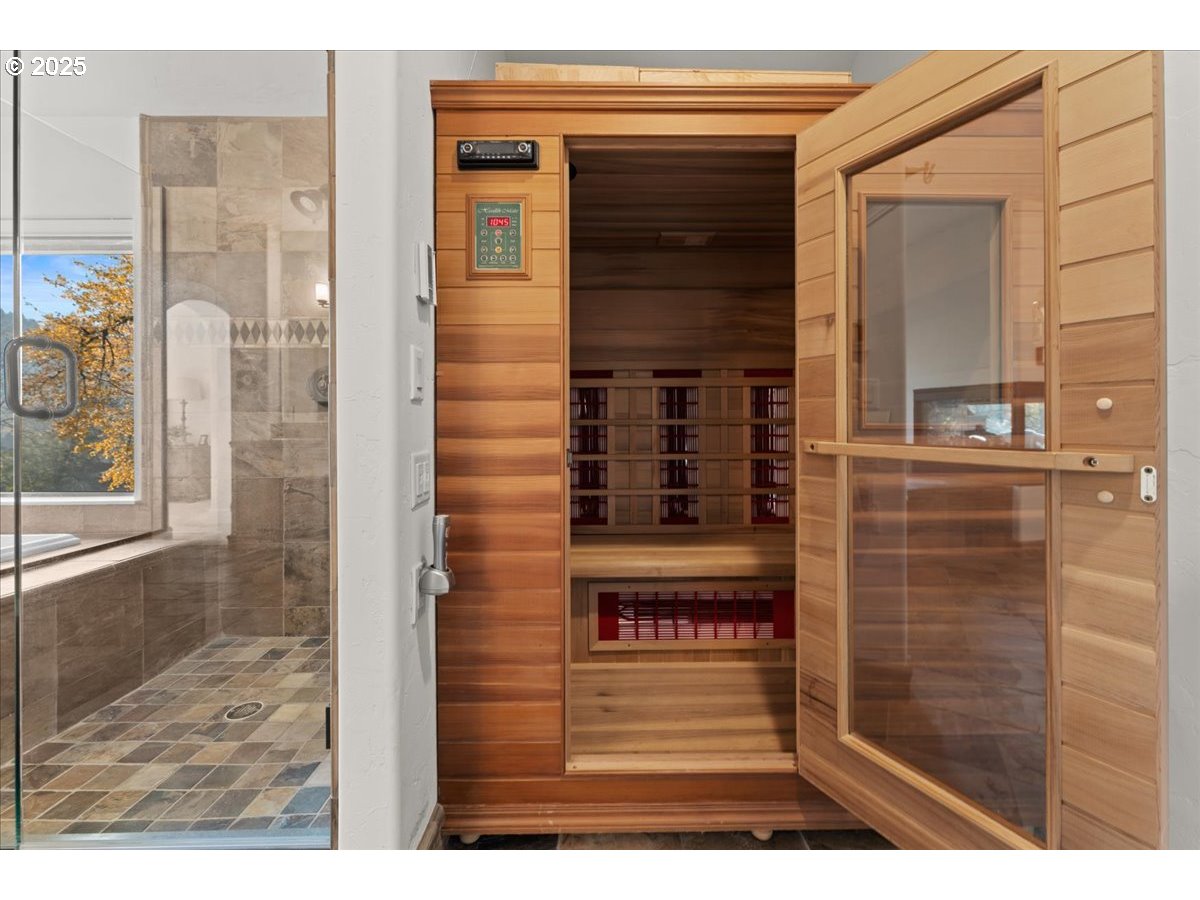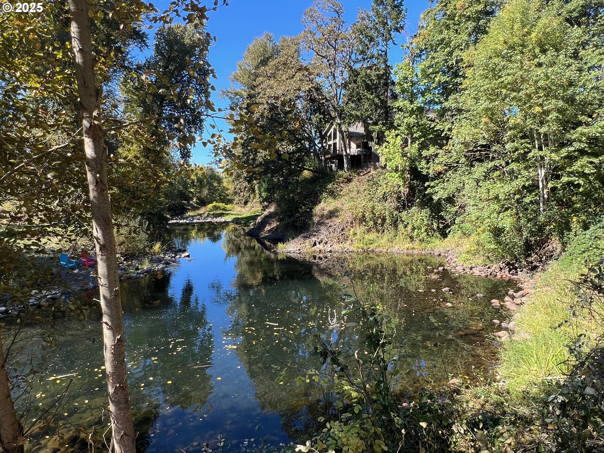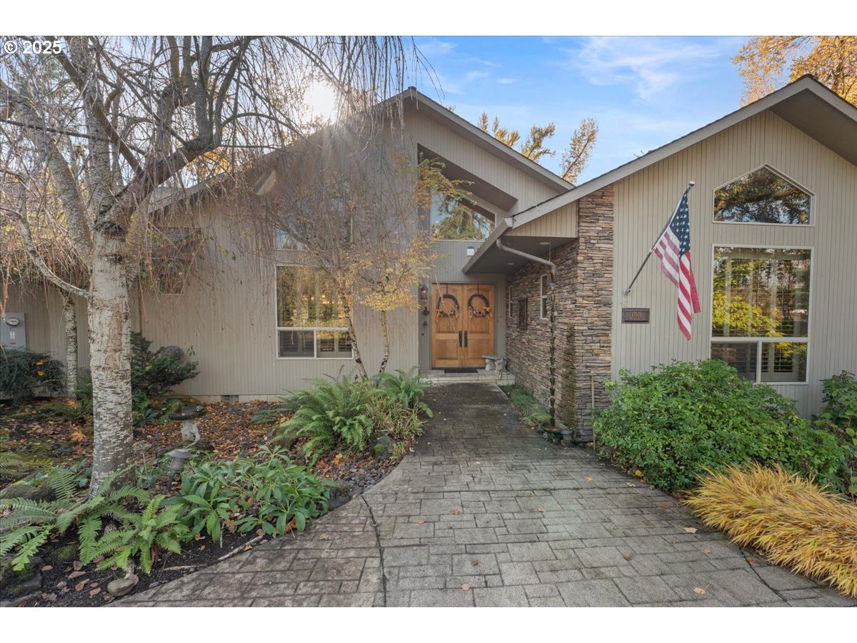 Built on a bluff above Abiqua Creek, this architecturally designed, one-level, South-facing home feels like it’s in a remote section of Colorado. Convenient to population centers yet so far from the madding crowd. With a highly functional layout and 2 of 3 garages near the kitchen, the home flows logically from one space to another. Large windows offer constant views and the sound of two year-round rapids, a gentle reminder of the flow of water and time. Enter the great room through 9’ carved Hickory doors. A gourmet kitchen (2 DWs) with a huge, curved granite counter is designed for easy entertainment. The master B/R has a unique view and deck, as well as a large bathroom with jacuzzi, shower and sauna, while a 2nd B/R is a smaller master with a full bath. An attached, private ADU has equally gorgeous but different river views and private deck, serving as a 3rd bedroom. It’s adjacent to a separate, 3rd garage for private use by a resident if desired. A 20x24 concrete pad/foundation is ready for adding an outbuilding. Directly across the road is a beautiful 100-acre Vineyard and tasting room, which complements the rural but bountiful setting for which this area is becoming famous. Three inside gas fireplaces, and one outside provide auxiliary heat and ambiance while the main deck mimics the finest treetop restaurant setting, surrounded by mature trees lining the river. All provide shelter for many species of birds along with perfect summer shade. In Fall the colors are spectacular. It is truly difficult to find a more pleasant place to be or entertain. During extra hot days of summer, swimming holes below offer cooling, slow-moving water from the river known as Abiqua Creek. The tree house effect simulates a 15-acre private sanctuary. Lots to discover in this home and its spectacular location.