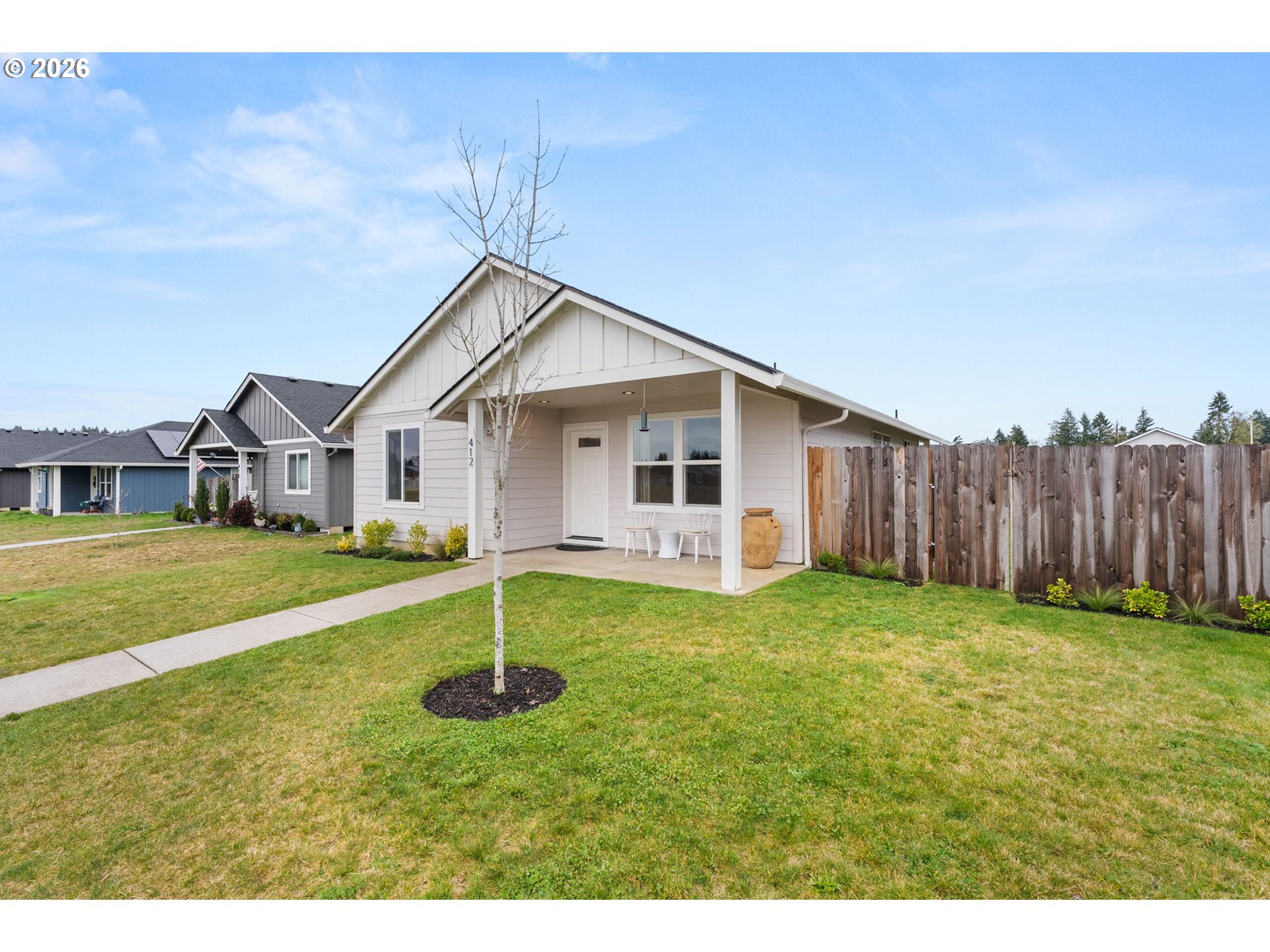 Welcome to this well-maintained 3-bedroom, 2-bath home in desirable Grand Prairie Estates! Offering over 1,200 sq ft of comfortable living space, this home features an open floor plan that feels bright and welcoming. The kitchen is thoughtfully designed with stainless steel appliances, tile backsplash, ample cabinet space, and an eat-at bar—perfect for casual meals or entertaining. Stay comfortable year-round with an energy-efficient heat pump mini-split system providing both heating and cooling. Step outside to a fully fenced yard, ideal for pets, play, or relaxing outdoors. Enjoy the convenience of being directly across the street from a park and just 5 minutes from I-5, making commuting a breeze. A great blend of comfort, efficiency, and location—this home is move-in ready and waiting for you!