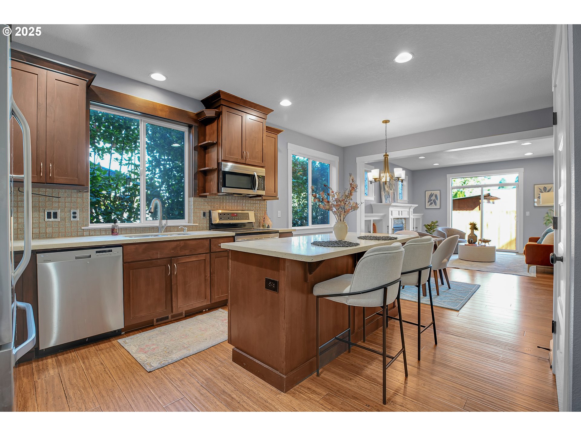 Lovely 2016 Craftsman on a desirable NE Portland offers 1,711 sq ft of light-filled living with 3 bedrooms and 2.5 baths, and new carpet throughout. The main level welcomes you with engineered wood floors, a cozy fireplace flanked by built-in bookshelves, and a chef-ready kitchen featuring a large island with hardstone counters, tile backsplash, built-in microwave, electric freestanding range, and stainless steel appliances. Upstairs, you’ll find two full baths—each with a skylight—and three rooms, two of which capture striking views of Mount Saint Helens. Outside, enjoy a private fenced patio and low-maintenance yard, plus a single-car garage with a hanging storage rack; practical comforts include a gas furnace, gas water heater, and included washer and dryer. Conveniently close to I-205, this move-in-ready home blends modern finishes with classic Craftsman charm.