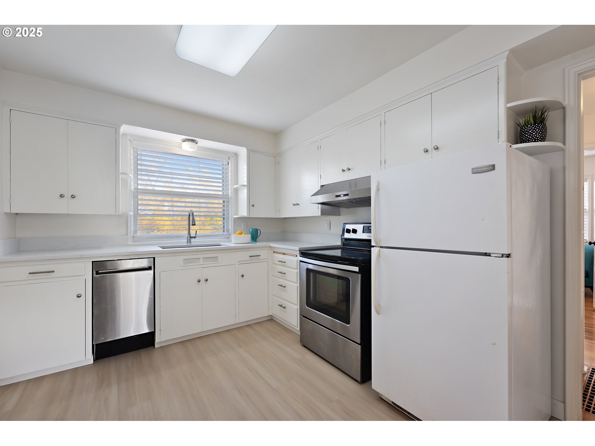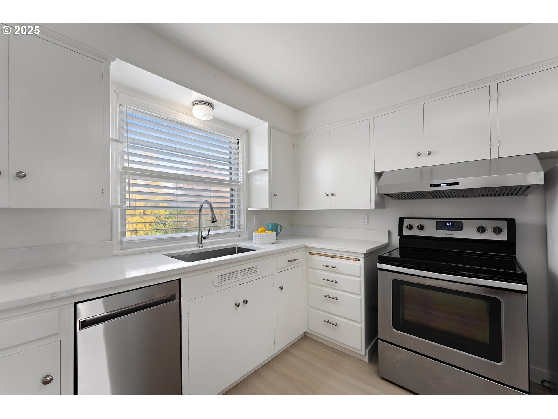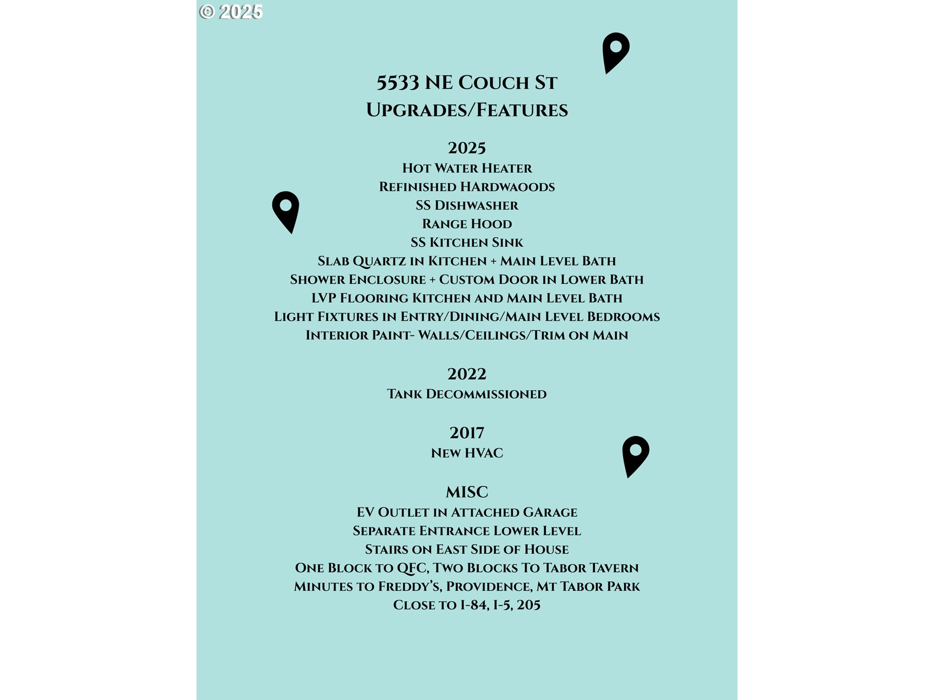 Great location in North Tabor, easy living with lots of updates. Just the right size and with the conveniences you need- attached garage plus two beds and full bath on main. Gleaming, newly refinished hardwoods paired with large windows make the living room warm, bright and welcoming. A woodburning fireplace with mantle add to the coziness factor. The spacious area has plenty of room for guests to gather. New paint throughout is a blank canvas for art and decor. Newer central air conditioning ready when summer returns. Updated kitchen is equipped with a brand new SS dishwasher, hood, quartz slab counters, large SS sink and LVP flooring. Main floor bath also features new LVP flooring, sink and slab quartz counters. Both upstairs bedrooms, dining room and entry have beautiful light fixtures. Separate entrance downstairs, for possible ADU or multi-gen living. Steps to the basement entrance are along the east side of the house. Lower level has large laundry area with washer & dryer, allowing plenty of room for cabinets, shelves, and hanging space for wash day. A full bath with new, shiny shower stall is next to the spacious, non-conforming third bedroom, perfect for guests or teens who prefer a little privacy, media room, craft area, play room- or WFH space. The adjacent storage room is large enough for sports/camping/ski equipment, or could be finished as a den for extra living space. Attached garage has EV outlet installed. Substantial, private back yard is a possible space for a detached ADU (Buyer to do due diligence).This North Tabor home is conveniently located 1 block from QFC, 2 blocks from Tabor Tavern, and just minutes to Fred Meyer on Glisan, Providence Hospital, and Mt Tabor Park. Sewer line replaced in 2017, tank decommissioned in 2022, new hot water heater 2025. Move-in ready so you can get settled before the holidays.