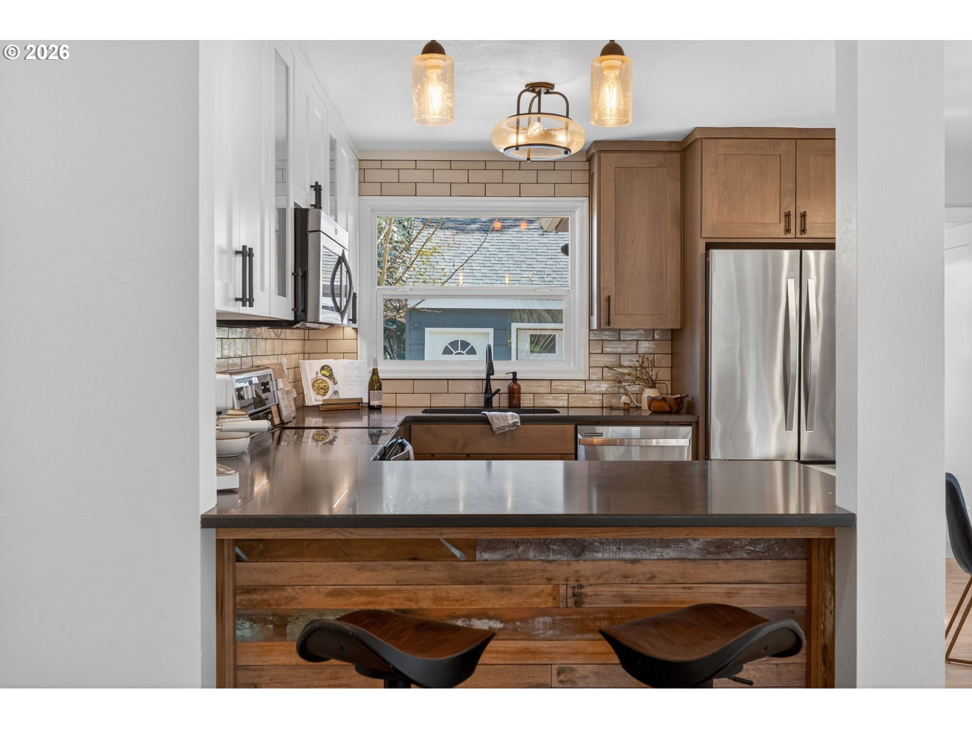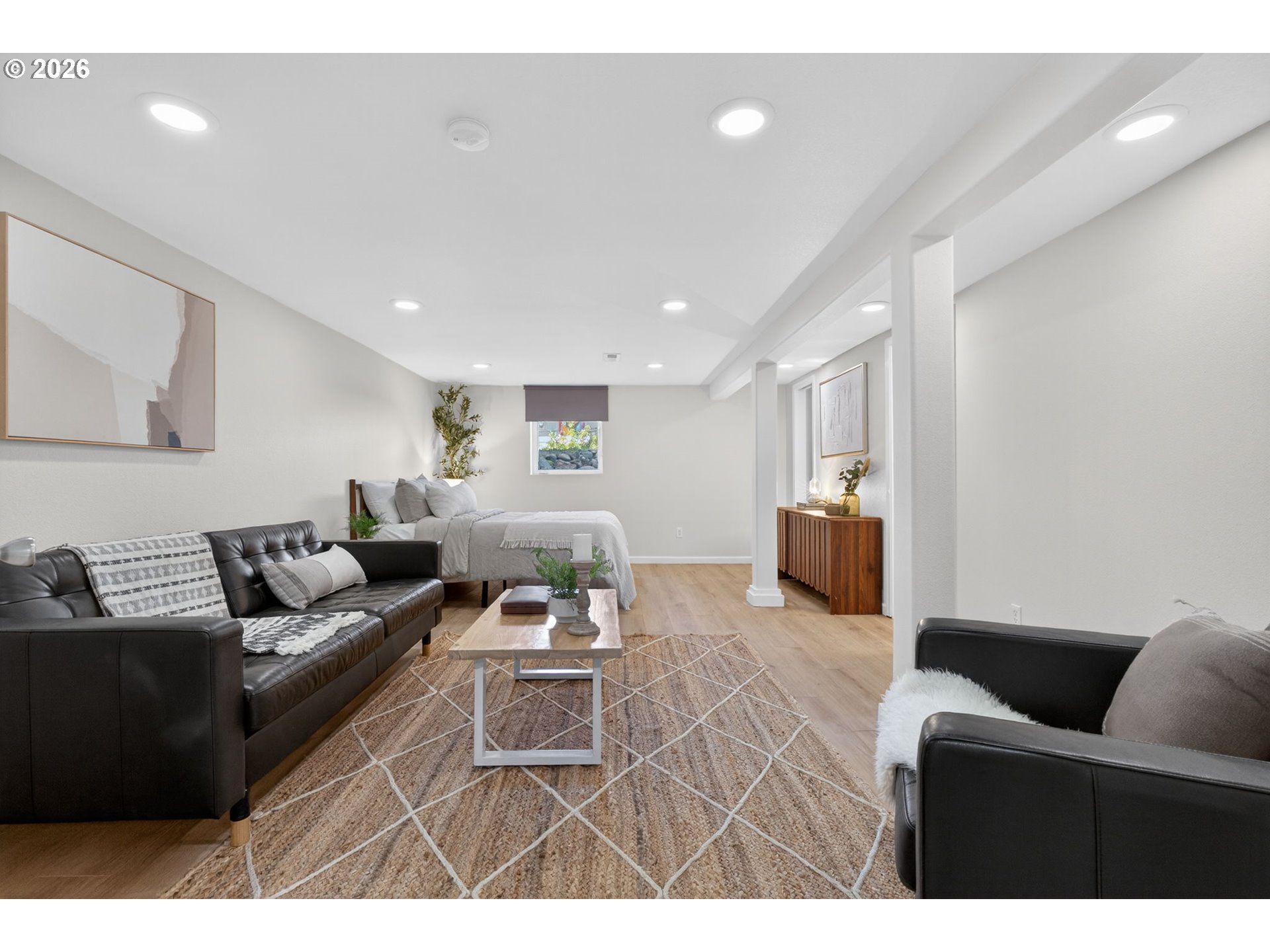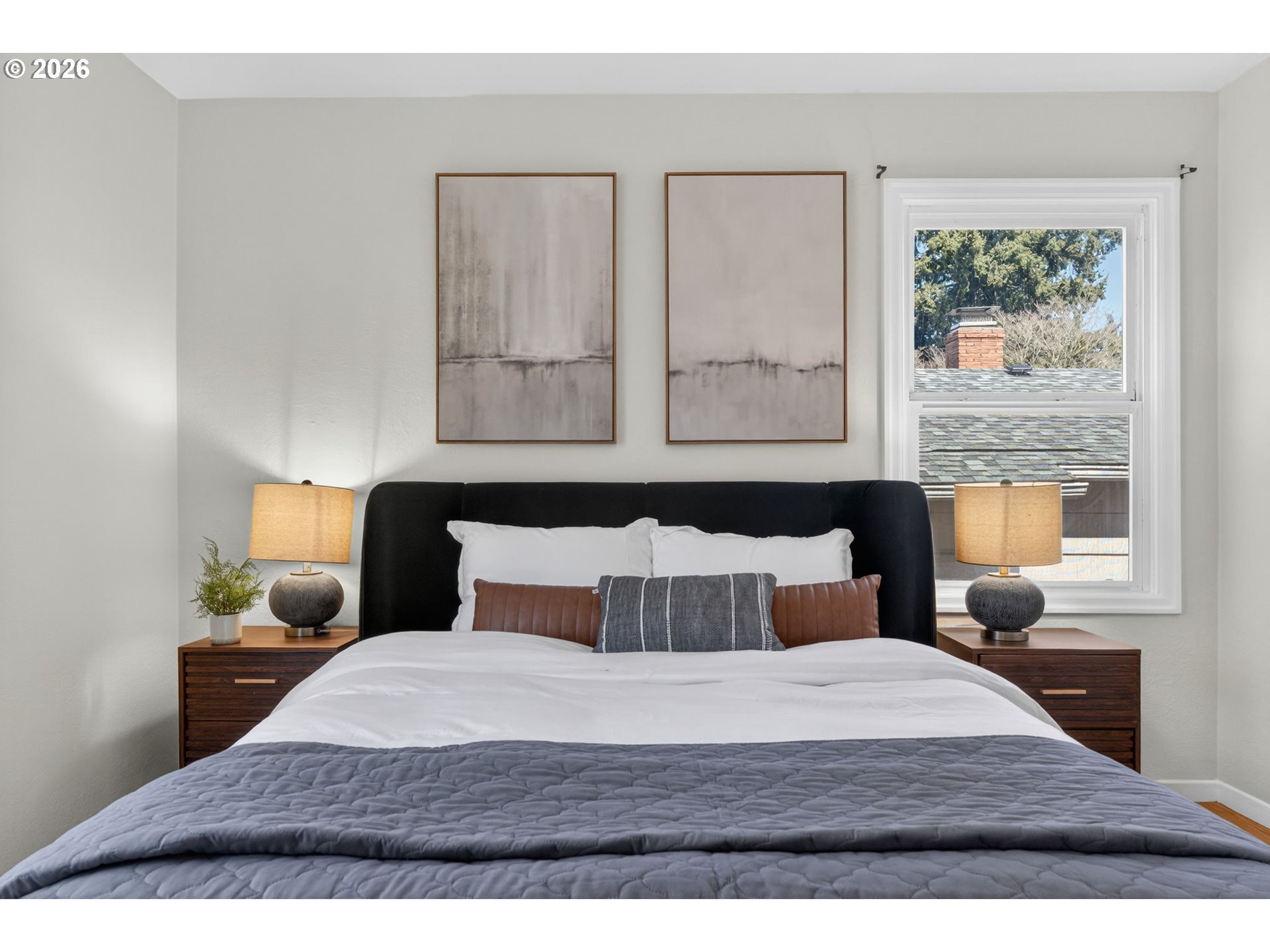 This is an adorable Roseway bungalow that's been lovingly and practically updated. Even before you step in, the charm begins on the front porch great for sitting. Inside you're warmly welcomed by the living room with hardwood floors, reclaimed wood hearth and built in shelving. The kitchen is open to the living room, incredibly functional and includes a bar seating area. Two bedrooms and a full bath round out the main floor. The current owners created a fully permitted primary suite in the basement, including a walk in closet, jetted tub and huge bedroom. The space includes enough room to add a kitchenette and create a second living area or simply take advantage of the room to set up crafts, games, workout... whatever you choose. Easy parking on the driveway leads to the two car garage great for studio space, an additional rec room, or even an actual place to park your car. With Wellington Park, Guilder Coffee and food carts nearby, the Roseway neighborhood offers as much charm as this well kept home. [Home Energy Score = 8. HES Report at https://rpt.greenbuildingregistry.com/hes/OR10246472]