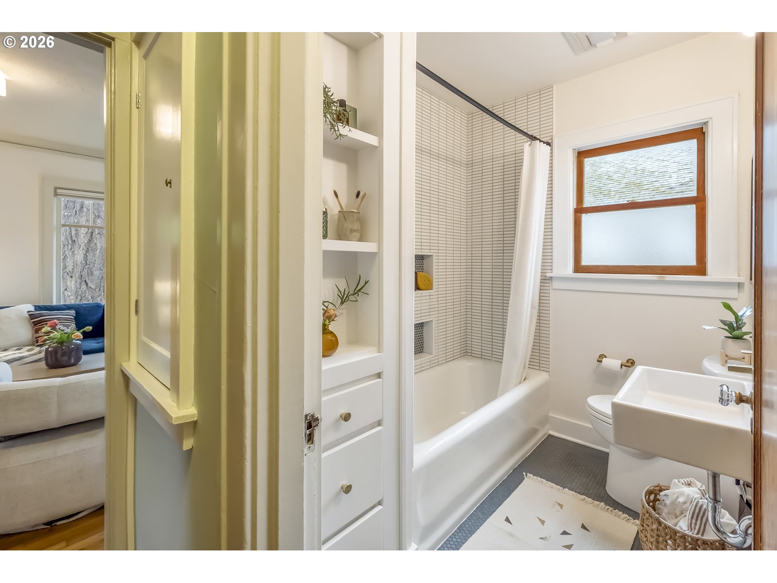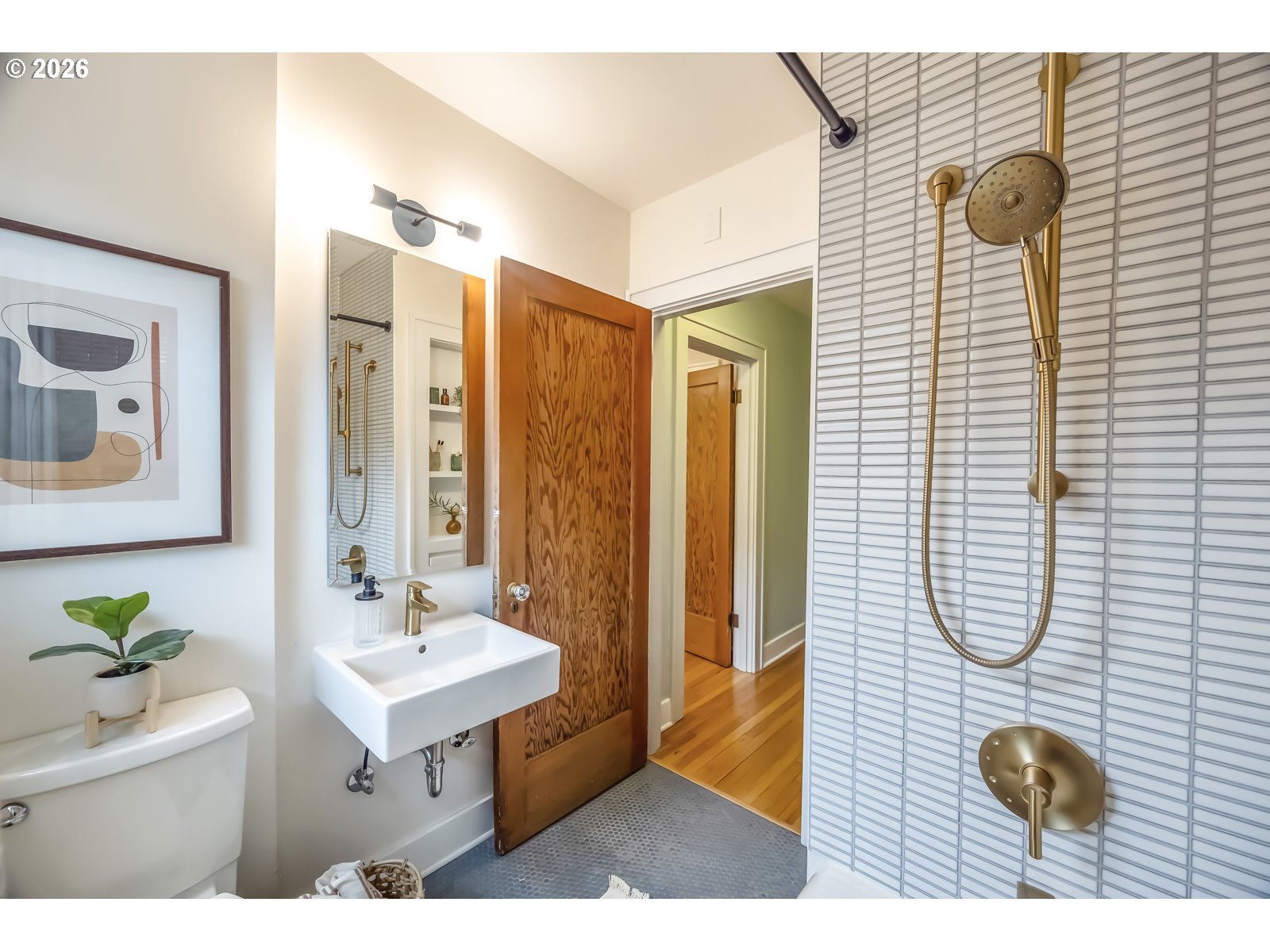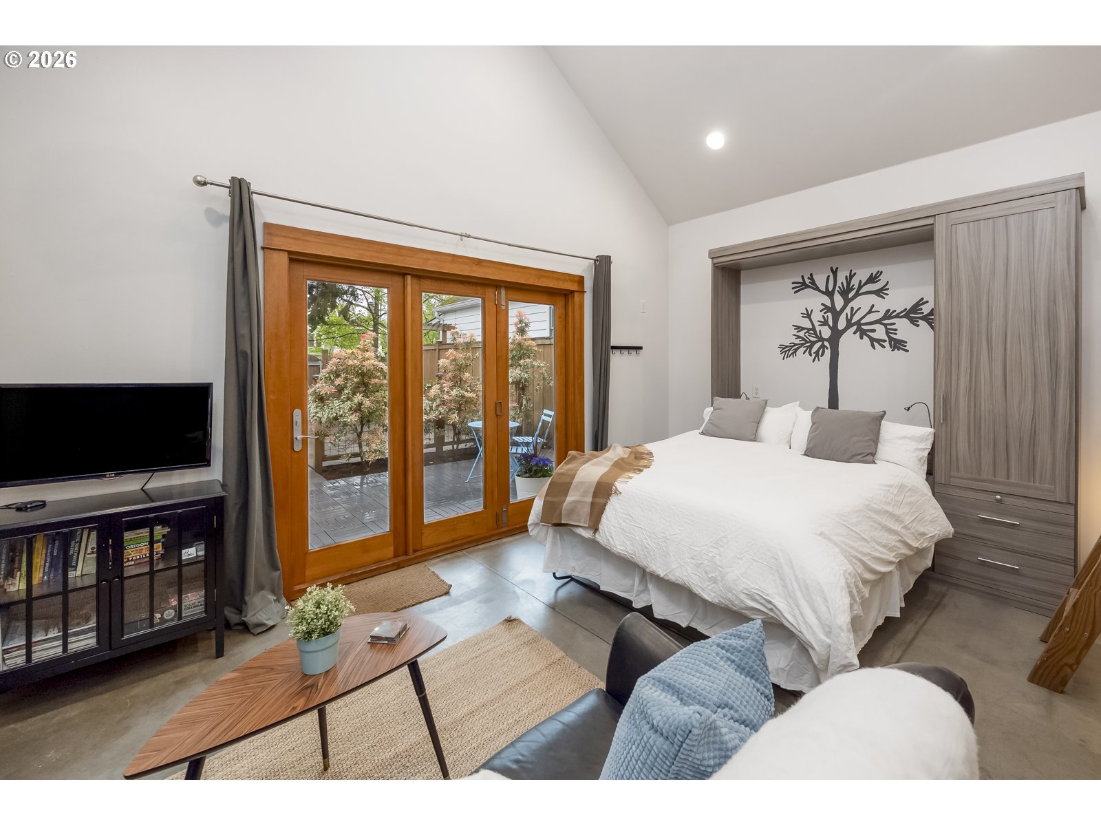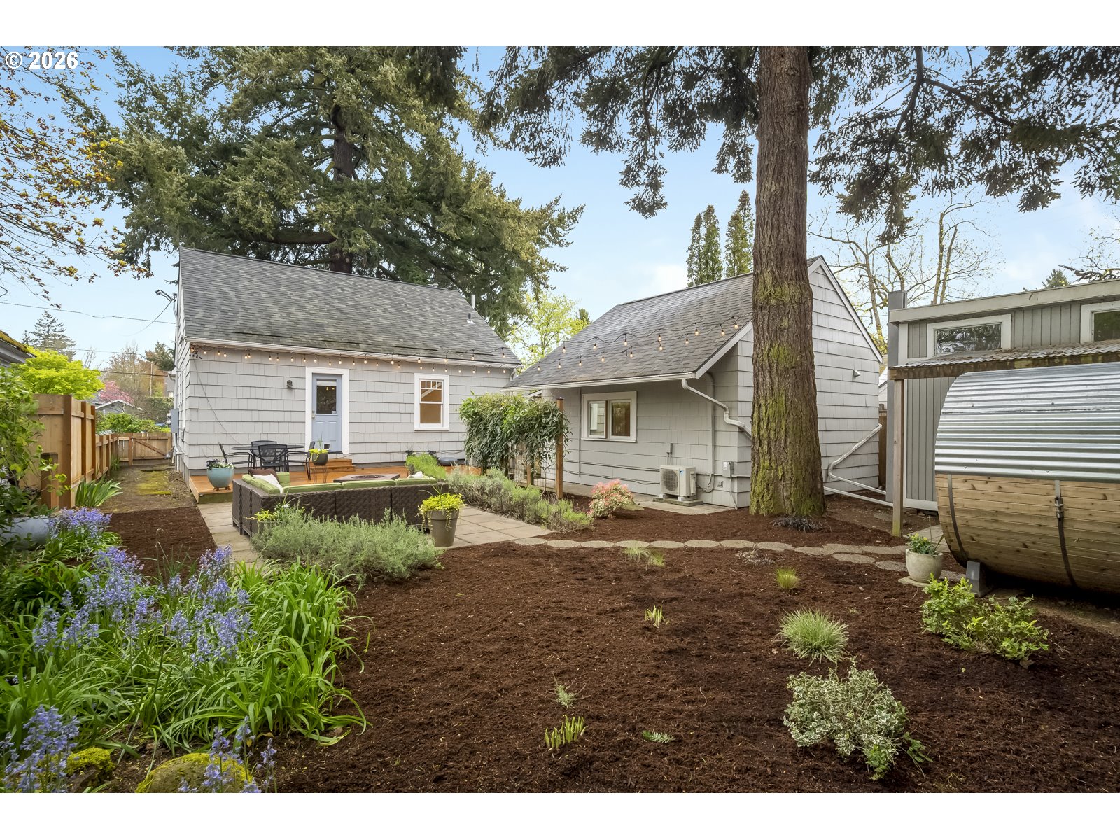 Located in Rose City Neighborhood, this light-filled home blends thoughtful design with modern comfort. Wrapped in cedar shake this English story-book home stands proud under the comfort on a grand fir tree. Inside you can feel the warmth of a gas fireplace and shelving to hold your favorite books. The large bay windows in the dining room let northern sunlight while pearl drop fixtures set the mood. Paper stone surfaces against solid cherry wood & stainless anchor the kitchen. Two main-floor bedrooms are thoughtfully arranged near a centrally located bathroom, complete with artistic tile and high-end fixtures. Upstairs, the private primary suite offers a peaceful retreat with skylights and a cedar-lined walk-in closet.The lower level expands your living space with a generous den or office—ideal for movie nights—alongside a second bathroom, laundry room, and a carpeted storage area. Step outside to a spacious backyard designed for both relaxation and entertaining, featuring a jasmine-covered trellis, a cedar deck, and a paver patio intend for a cozy fire. A detached ADU provides excellent income potential or a comfortable space for guests. The fold down Murphy bed, concrete floors and compact kitchen make it a breeze to manage. The 150 sq ft powered tool shed and extra-deep driveway add convenience and flexibility. All just moments from Fremont Street’s popular shops, cafes, yoga studios, and morning coffee spots. [Home Energy Score = 3. HES Report at https://rpt.greenbuildingregistry.com/hes/OR10247056]