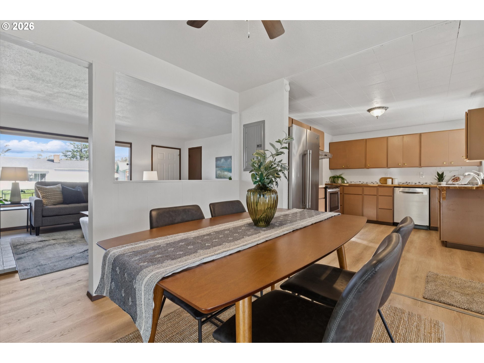 Well-maintained single-level ranch on a larger-than-typical lot with a detached oversized two-car garage. This 1959 home offers 3 bedrooms, 1 bathroom, and a functional layout that includes both a living room and a separate family room—an uncommon feature for homes of this size.Two wood-burning fireplaces—one in the living room and one in the family room—provide warmth and character, while the additional living space offers flexibility for everyday use, hobbies, or gatherings.Recent updates include a new roof (2026), newer forced air gas furnace and gas water heater (within the past few years), and stainless steel kitchen appliances. Interior improvements include fresh paint, updated flooring, and butcher-block counters in the kitchen.The fully fenced yard provides usable outdoor space with room for a variety of uses, along with a pergola-covered patio area. The detached oversized garage offers additional storage, workspace, or parking options beyond what is typically found in similar homes.A rare combination of single-level living, added square footage where it counts, and a larger lot—this home stands out for its versatility, functionality, and everyday livability.