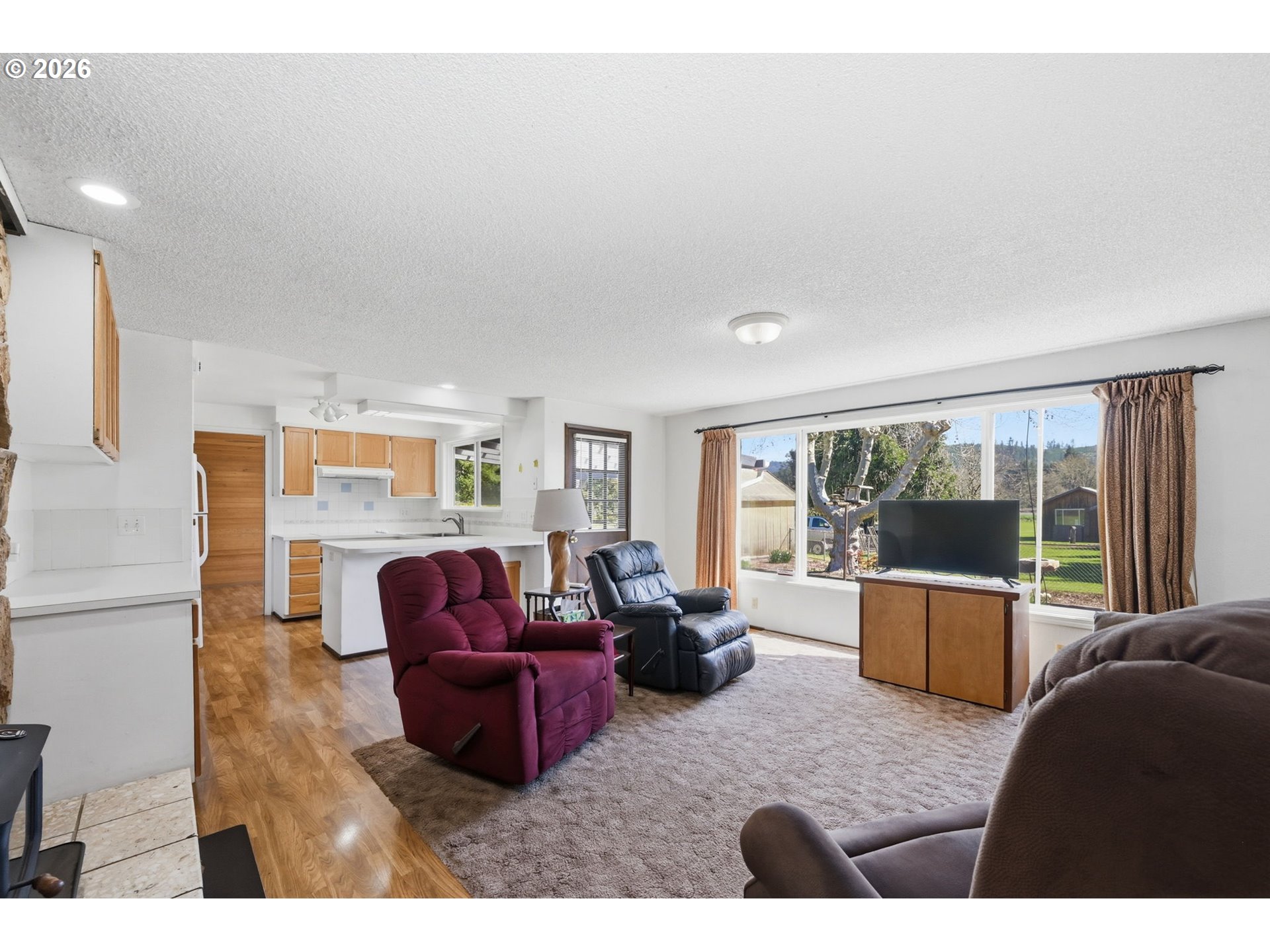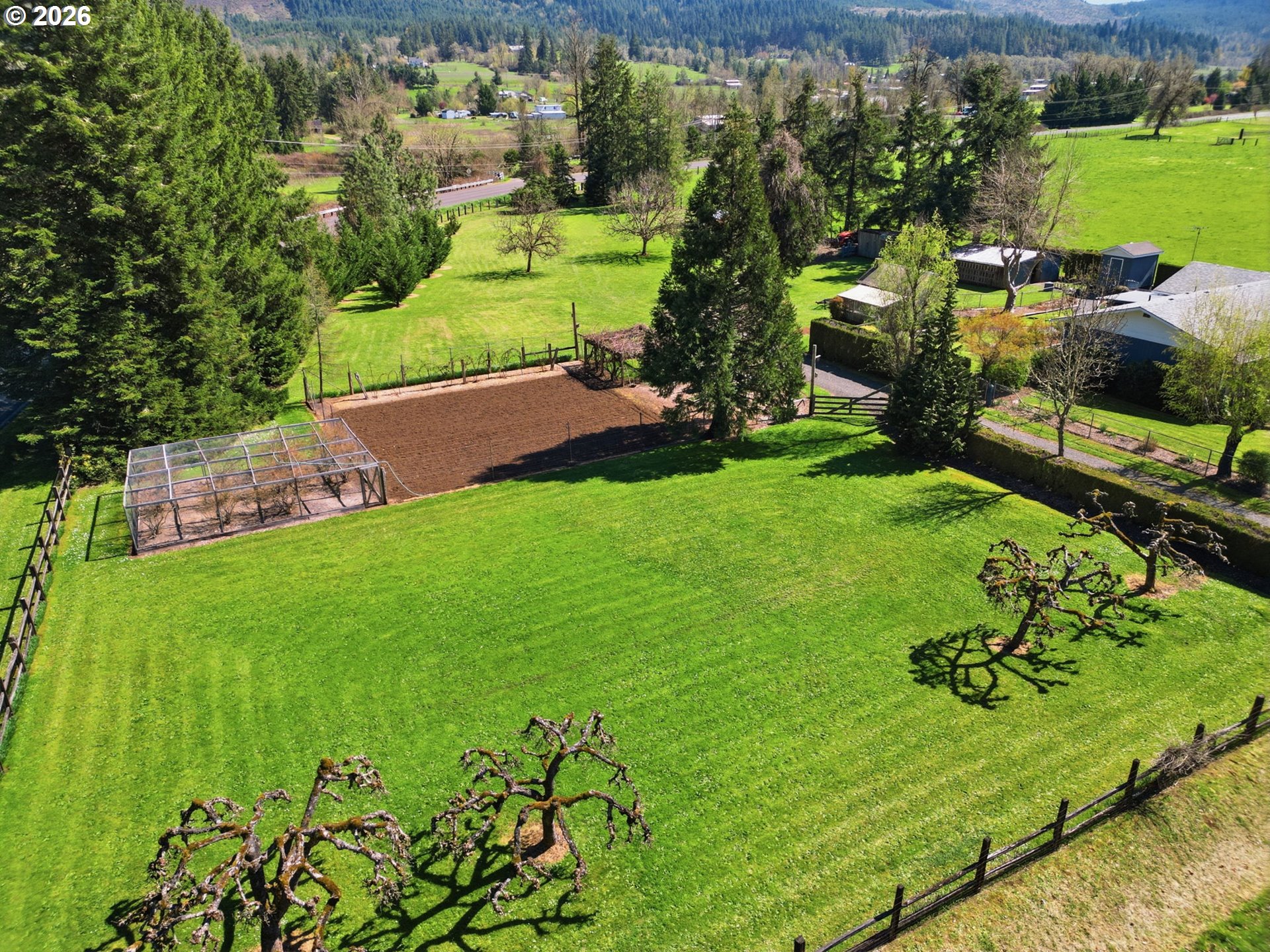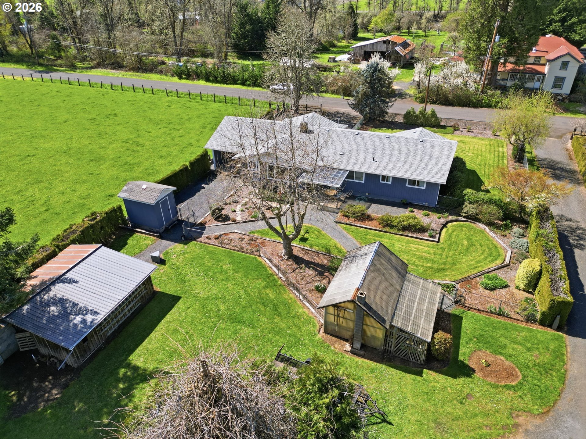 Welcome to your own slice of country living in Lost Creek Valley on 1.88 usable acres where open skies, peaceful surroundings, and room to grow create a lifestyle full of possibility. This corner lot, single-level, 3-bedroom, 1.5-bath home offers a flexible layout with multiple living spaces, including a sunken living room and a separate living area featuring a Midgley’s wood-burning fireplace insert set within a masonry fireplace designed for improved efficiency, along with large windows that bring in natural light and views of the surrounding landscape. The main bathroom has been updated. Two mini-split heating and cooling systems provide efficient year-round comfort. The kitchen offers ample storage and workspace with an easy flow into the dining and additional living areas, ideal for both everyday living and gathering. An attached two-car garage with a large attic above provides excellent storage. Roof replaced approximately 7 years ago. Step outside and enjoy open usable land with mature landscaping including fuchsias, lilies, azaleas, and rhododendrons along with grapes, thornless blackberries, blueberries, apple and walnut trees, and asparagus. The setup is ideal for hobby farming, animals, gardening, or simply enjoying space to relax and play. Additional features include a covered 14x24 carport, 24x24 outbuilding, large greenhouse, and separate fruit room building. The property is fully fenced, with additional cyclone fencing enclosing portions of the yard. Septic tank has been rebuilt and is functioning as designed. Located near Dexter Reservoir and Lookout Point Lake for boating, fishing, and outdoor recreation and just minutes to Pleasant Hill schools with convenient access to Lowell, Fall Creek, Goshen, Creswell, and Eugene/Springfield. Situated in the 100-year flood zone, buyers must complete due diligence.