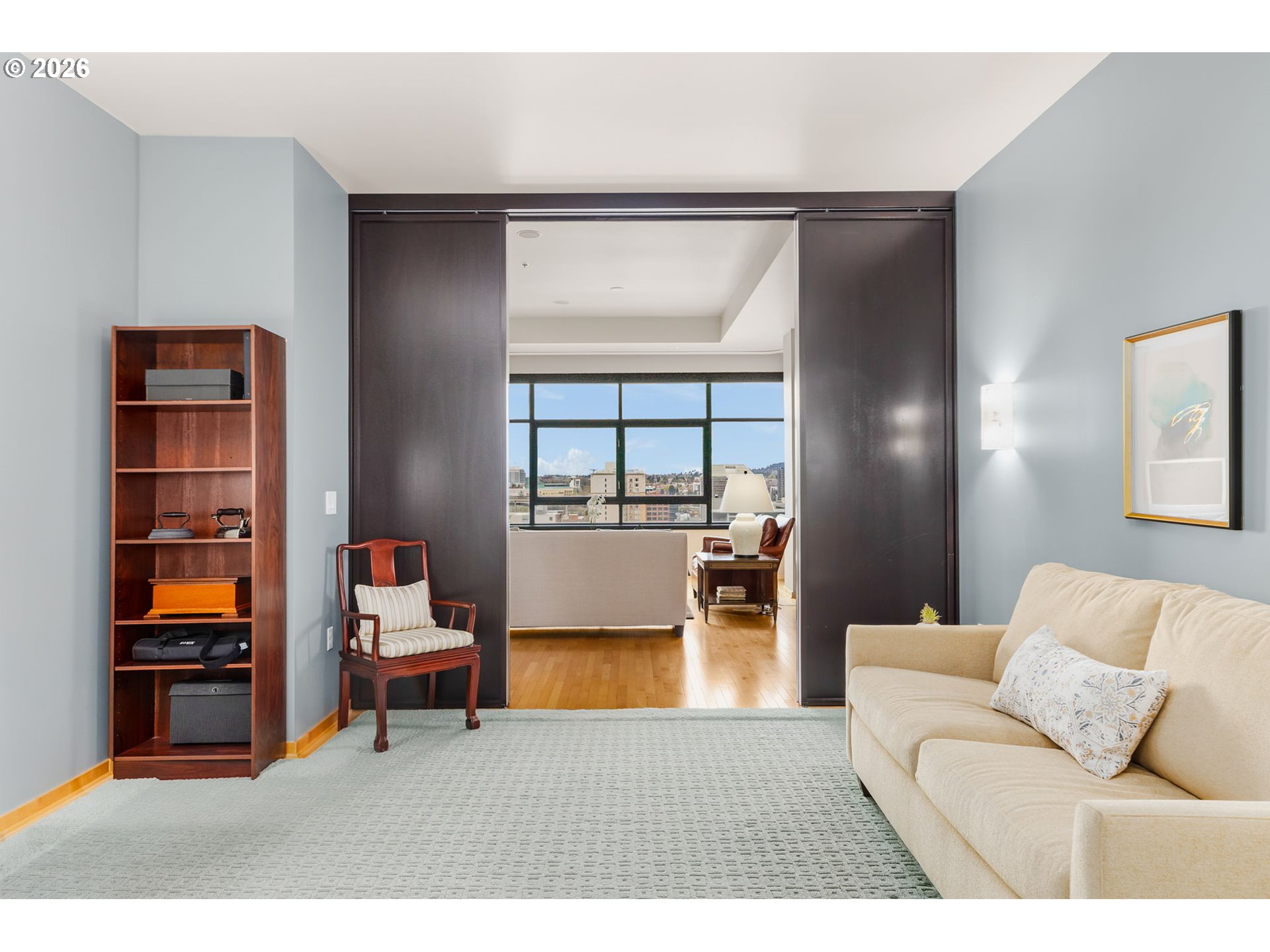 Embodying the very best of the “Pearl District lifestyle,” this high-end luxury penthouse in the coveted “Elizabeth Lofts” building checks every box. This sophisticated northeast corner unit offers 180-degree unobstructed views of three mountains, the Willamette River, and the West Hills. Floor-to-ceiling windows frame the ever-changing mood and hues of the city, while natural light abounds throughout. The sprawling 2,700-square-foot floor plan is designed for both grand-scale entertaining and intimate everyday living, with gleaming hardwood floors flowing seamlessly, complemented by soaring ceilings and designer lighting. Anchoring the main living areas, a double-sided gas fireplace serves as both a subtle architectural divider and a refined focal point. Lutron motorized shades and custom drapery are featured throughout. The gourmet kitchen showcases high-end finishes, a large island, and Sub-Zero appliances. The primary suite offers a serene sanctuary, complete with dual closets, a spa-caliber bathroom, and French doors opening to a 625-square-foot private outdoor terrace. The second bedroom was converted into a media room by a previous owner but can easily be restored to a second en-suite. Amenities include concierge service, a community room, and a large deeded storage closet adjacent to two deeded parking spaces. The Pearl District offers an exceptional lifestyle with boutique shopping, acclaimed restaurants, and vibrant cultural attractions.