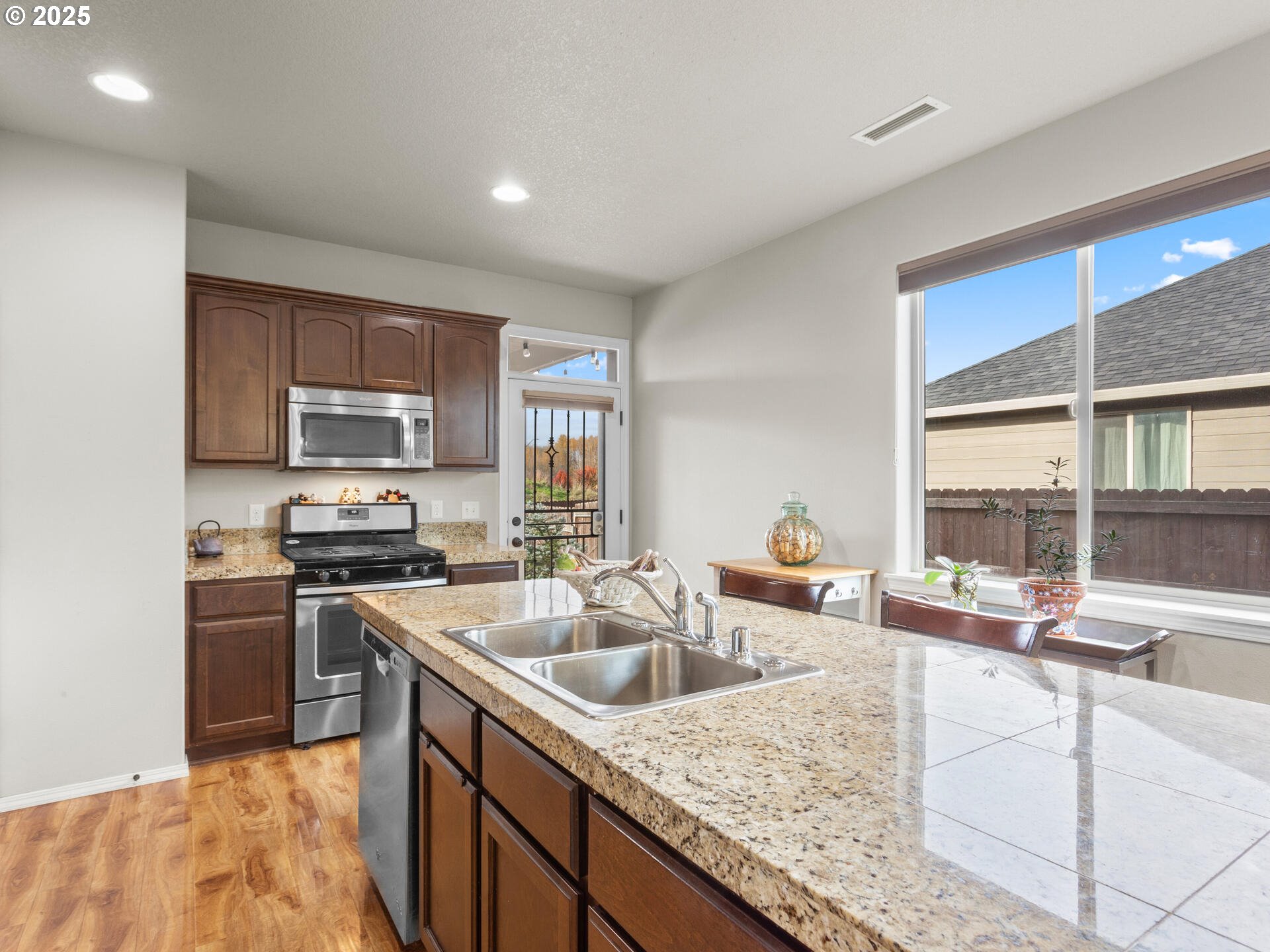Charming 3 bedroom, 2 bath home! This beautifully maintained one-story residence offers bright open-concept living area with large windows, gas fireplace and sleek laminate floors. A gourmet kitchen boasts stainless steel appliances, wooden cabinetry, and granite countertops. Oversized island is an entertainer’s dream. The primary suite offers an en-suite bath with double sinks and a walk-in closet. Two additional bedrooms and a modern full bath offer flexible living space. Custom window treatments throughout allow tasteful privacy. Enjoy the beautifully landscaped backyard equipped with automatic sprinkler system. Spacious two-car garage with ample storage space. All appliances included making this move in ready for all. Situated in a great neighborhood, this home is centrally located near parks, shopping, and dining options. Enjoy easy access to major highways and public transportation. Don’t miss out on this gem – schedule a private tour today!