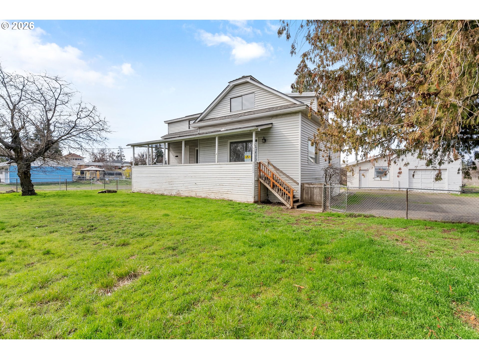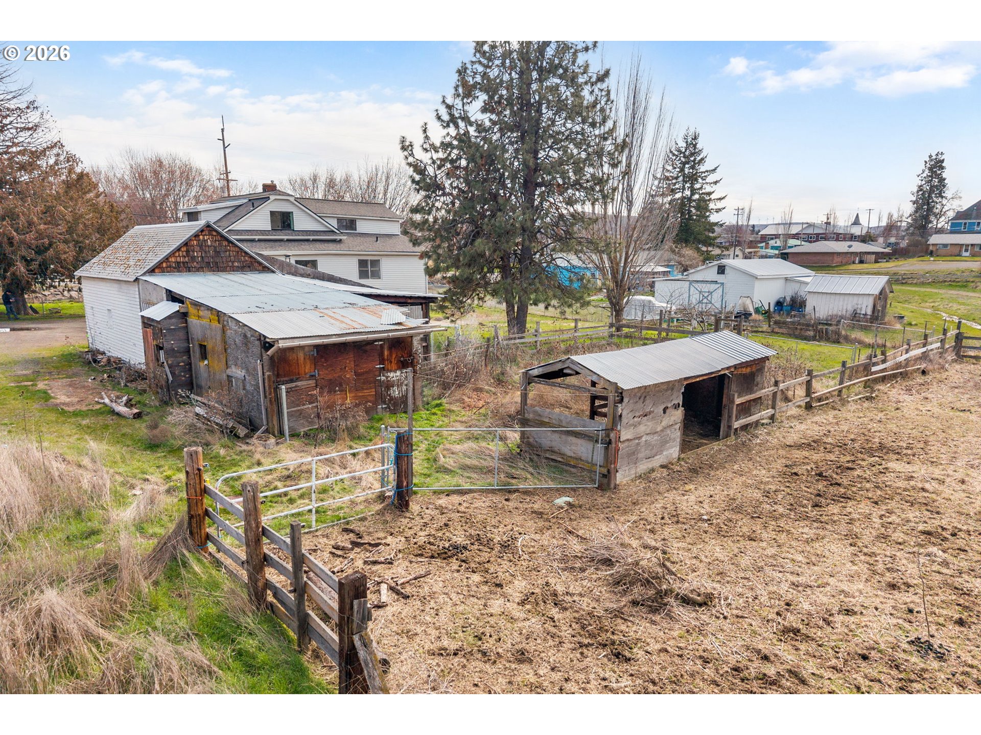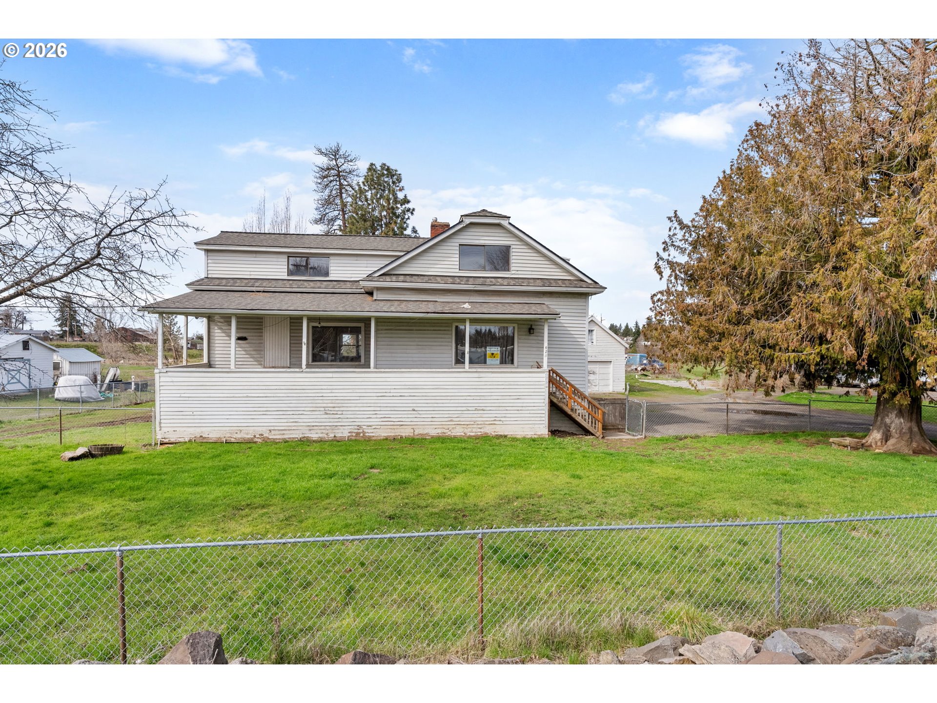 This 1920-built 3 bedroom, 2.5 bath home offers approx. 2,061 above grade square feet on a level 0.86-acre lot in Goldendale. This farmhouse features vinyl siding, a composition roof, a covered front porch, and a fenced front yard, with a detached one-car garage plus ample off-street and RV parking. Additional outbuildings include two horse stalls, a tack room, hay storage, and fenced pasture, along with a separate fenced garden area. The property includes a well for water service and public sewer, with city views. Interior spaces include living areas with high ceilings, multiple built-in shelving units, a primary bedroom on the main level, two upper bedrooms, and bathrooms on both levels. The unfinished basement provides exterior access and storage space,