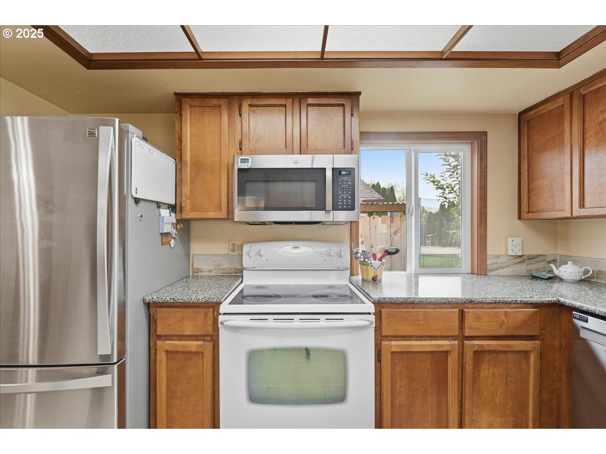 Original owner has lovingly cared for this spacious ranch, and it shows pride of ownership inside and outside. Southern exposure make the home light and bright. The backyard borders a BPA easement and gives the home an open feeling with no immediate neighbors behind you. You'll love the generous-sized living room that is open to the kitchen and dining room. It features beautiful hardwood floors and a cozy pellet stove that quickly warms the entire area. The updated kitchen features slab quartz countertops, newer stainless steel appliances, convenient pull-out drawers to maximize storage space, and the refrigerator is included. Formal dining area and kitchen had new flooring installed in 2017. Sliding glass door opens to patio that overlooks the private backyard. Convenient, concrete walkway leads to a tool shed and covered storage area located in the side yard off the garage. Utility closet has built-in cabinets for storage, and washer/dryer are included with the sale. Partially converted garage is used as a family room, but offers flex space, with a separate exterior door entrance. This area could be converted back to garage space, if desired. New carpet just installed in all bedrooms with a thick pad. King-sized, Primary bedroom, is situated for privacy, and features a walk-in closet. The bathroom was remodeled in 2015 and features a walk-in shower with a tile surround and glass door, new vanity with pull-out drawers, medicine cabinet mirror for extra storage, ADA toilet, and updated vinyl flooring. Double pane, vinyl windows make the home more energy efficient. Back and side yards are enclosed with a fence, and sprinkler system is in both front and back yards. List price includes a new roof to be installed prior to closing. One year home warranty included as well. Convenient, close-in location, with easy freeway access. Don't miss out on this great opportunity to make this your new home!
