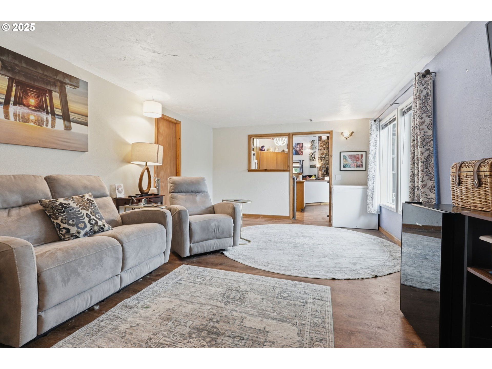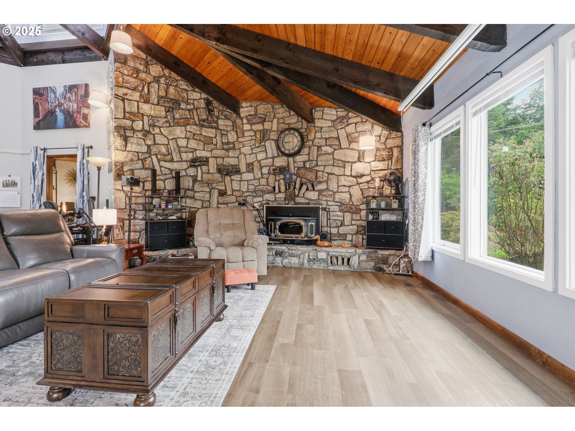 Welcome to this one-of-a-kind custom lodge-style home on nearly three-quarters of an acre! Featuring 3 bedrooms and 2 baths, this 2001 sq ft single-level home blends warmth and character with modern comfort. Stunning vaulted wood-beam ceilings, rich stone fireplace, and abundant natural light create a truly inviting living space. The kitchen offers solid oak cabinetry, built-in oven, cooktop, and instant hot water—perfect for the home chef. Thoughtful accessibility features include a roll-in shower, wide hallways, and garage access on the main level. Outside, enjoy the expansive yard with mature landscaping, fenced garden, chicken coop, and raised beds. Entertain or unwind on the covered porch or back patio while taking in the mountain and territorial views. A large shop and second garage provide space for hobbies, storage, or RV/boat parking with hookups. Located just minutes from town yet offering peaceful country living—this rare Lebanon gem is move-in ready and full of charm!