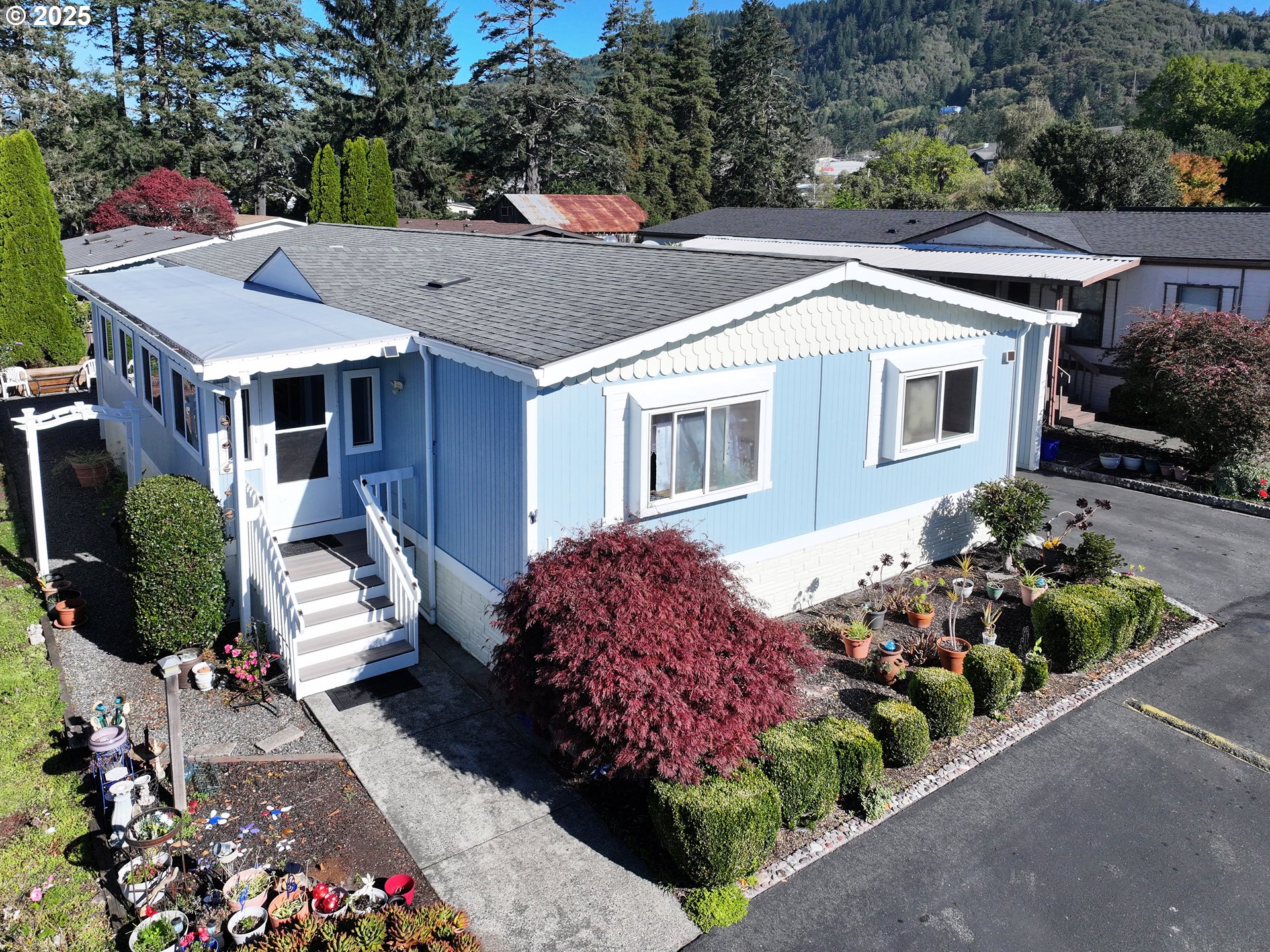 Charming, spacious and very well maintained home in one of the nicest parks in Brookings with a large updated kitchen that includes a desk area, extremely nice cabinets with abundant storage, island with eating bar, large pantry, instant hot water, nice size dining room just off the kitchen, huge living room, large enclosed porch with lots of windows, primary bath features a lovely shower and vanity and has lots of storage cabinets, enclosed garage which is a rare find in this wonderful 55+ park that features a recreation/meeting room that includes clubhouse, exercise room, kitchen, meeting room and pool table, walking path to the beach, fenced RV and/or boat parking when apace available for a very reasonable rate of $25.00, space rent is very reasonable at $475.00.which includes water, sewer and trash! 30 year Roof was new in 2012, furnace was just serviced and is only 5 years old, exterior paint 3 years ago, dishwasher is brand new, the refrigerator in garage stays if the buyer wants it, new flooring in both baths and laundry area, cute trellis in the yard, raised beds too, large shed/shop measures 10 X 12 featuring 4 electrical outlets and one 220 plug, an additional shed in back yard for garden tools etc. There is an irrigation system but is not operational at this time. Water heater is 8 years old. This wonderful home has been well maintained and loved. Its ready and waiting for you. Please come and see it, you will be glad you did.