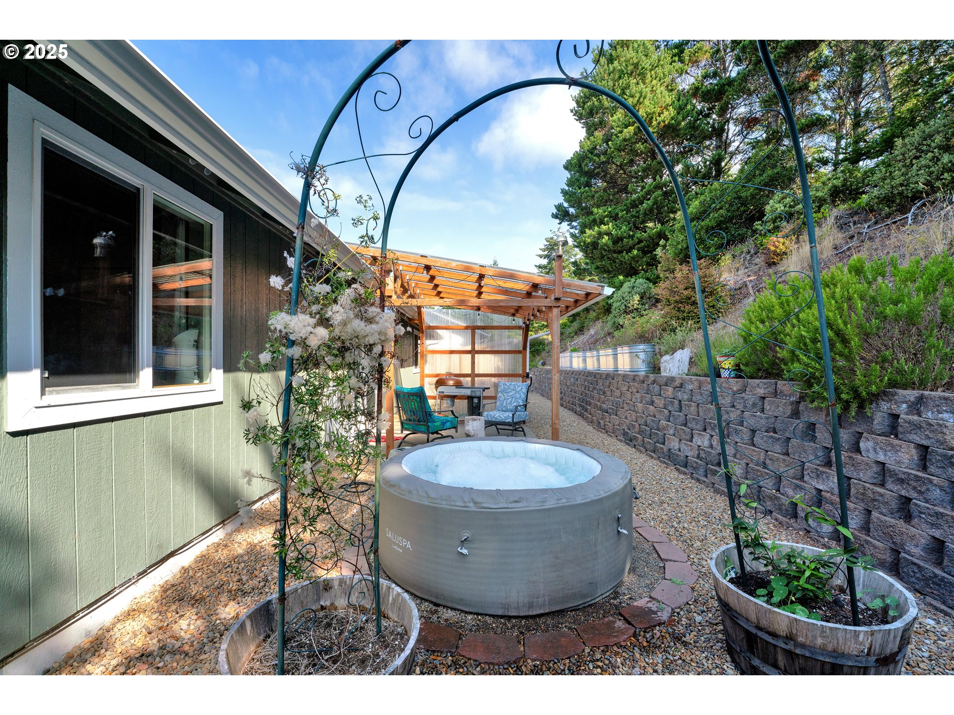 Welcome home to this beautiful and well-maintained 3-bedroom, 2-bathroom residence, nestled in the highly sought-after Park Village community. You'll love the prime location, offering the perfect blend of coastal tranquility and urban convenience, conveniently located to the hospital, vibrant downtown shops, and restaurants. Step inside and discover an open, airy, split-floor plan that creates a seamless flow throughout the home. The spacious kitchen is a functional dream, featuring an abundance of cabinetry, newer appliances, and an eating bar for casual meals. The inviting living room and dining area boast vaulted ceilings, a glass sliding door, and a large window across the room that bathes the space in warm, natural light. Slide open the glass door to step out onto your private, covered patio. This serene spot is perfect for savoring a morning coffee or relaxing in the included spa while taking in the ocean air and listening to the tranquil sounds of nature. The tranquil primary suite is a true retreat, complete with a generously sized walk-in closet and a luxurious en-suite bathroom featuring a double sink vanity and a spacious walk-in shower. The thoughtful layout includes a dedicated laundry room with additional storage to keep things tidy. Outside, you can relax knowing your home is well-protected with a NEW ROOF installed in August 2024. The low-maintenance yard is an easy-care delight, featuring flowers that add a pop of color and charming curb appeal. The fenced backyard provides privacy, while the verdant green space directly behind the property offers a natural, peaceful buffer from neighbors. This home is a rare find, combining modern comfort with a picturesque and conveniently located community.