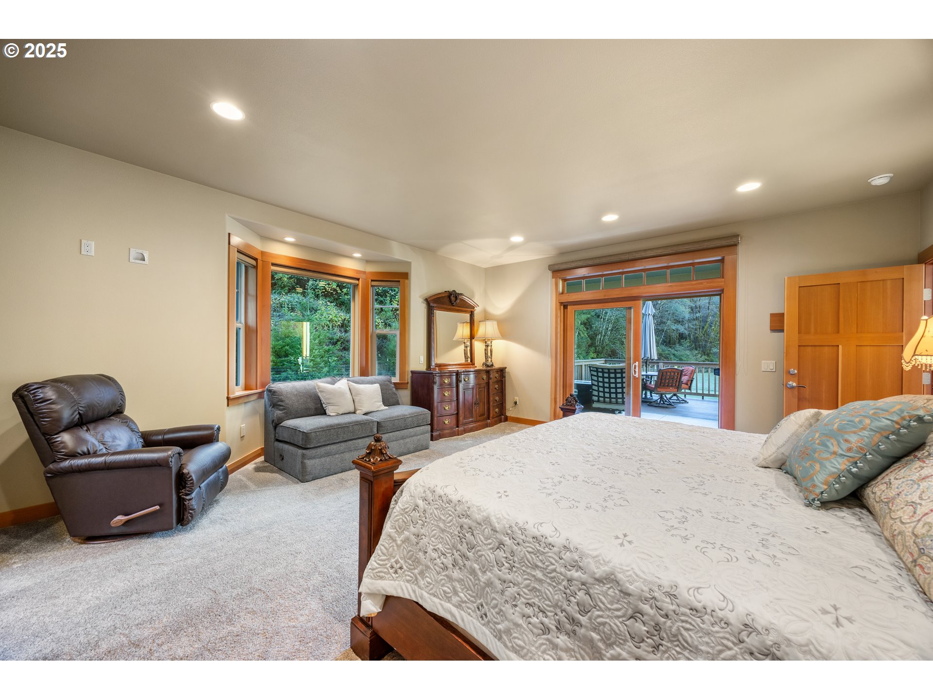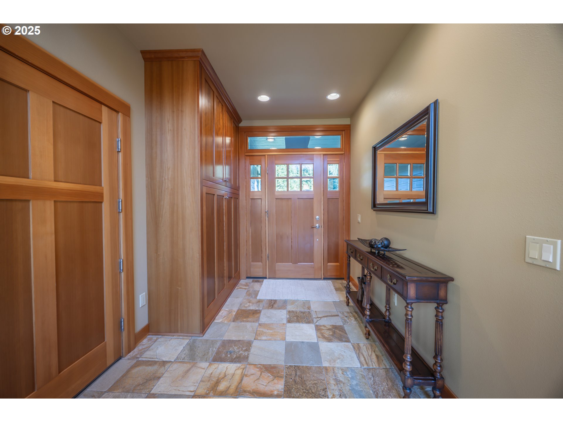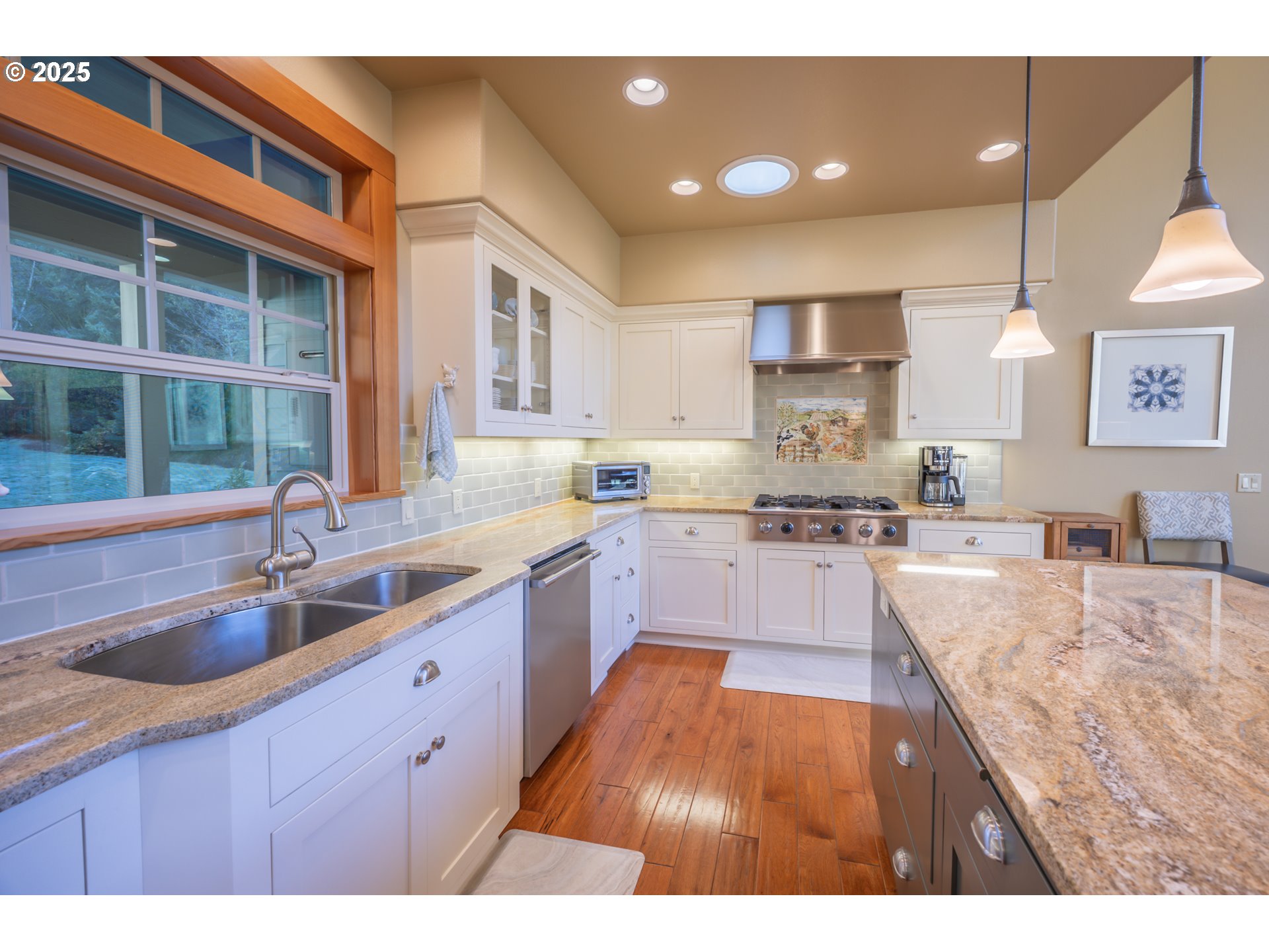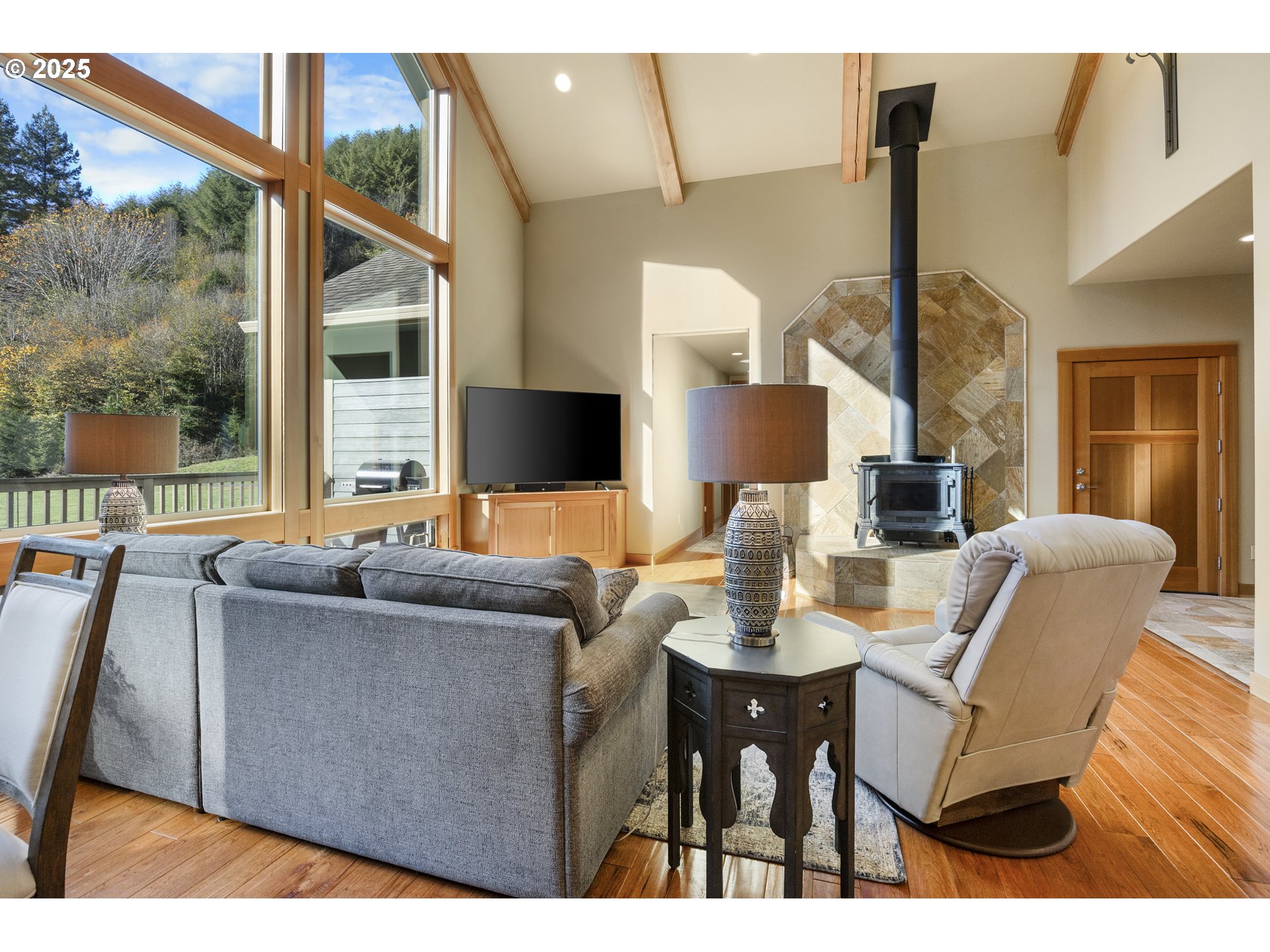 Tucked away on 9 private acres and embraced by 150 acres of pristine timberland, this exquisite custom-built home offers the perfect blend of seclusion and convenience just 3 miles from town. Designed with intention and crafted with care, the 3-bedroom, 2-bath residence welcomes you with a warm slate entry and soaring 18-foot windows that flood the open-concept living space with natural light. Rich hickory floors and open beam ceilings create a sense of rustic elegance, while solid CVG fir doors and custom cherry cabinetry add timeless sophistication. Warm up with the slate covered woodstove on those cold coastal mornings. The gourmet kitchen is a chef’s dream, featuring stainless steel appliances, Brazilian granite countertops, and thoughtful details throughout. Retreat to the serene primary suite or gather with loved ones in the expansive great room, where nature becomes your backdrop. The second bathroom has marble everything with radiant heated floors. Laundry room/ pantry has ample storage and large 2 car garage hides away all your outdoor toys. Beyond the home, the property is fully equipped for comfort and peace of mind: a 20KW automatic Kohler generator, two on-demand water heaters, a 1,000-gallon in-ground propane tank, and a hybrid heat pump ensure year-round efficiency. A secure gated entry, enclosed yard with electric fencing, and a 60-amp powered shed add both functionality and flexibility. Whether you're seeking a private sanctuary, a nature lover’s haven, or a refined rural lifestyle, this one-of-a-kind property delivers—offering beauty, privacy, and an abundance of amenities too numerous to list.