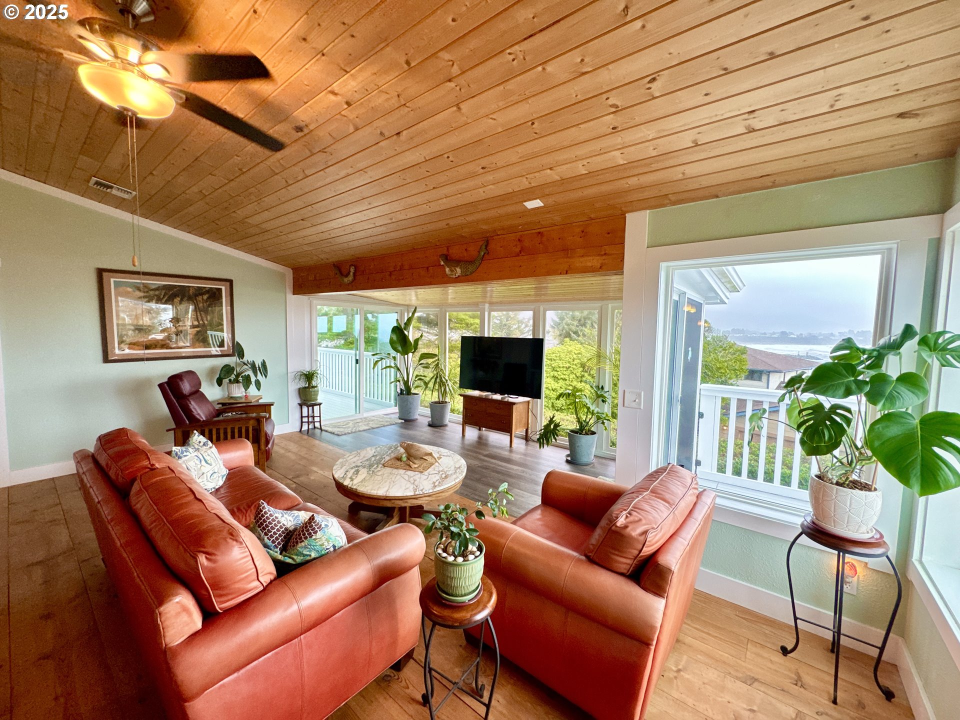 IMPRESSIVE OCEAN AND RIVER VIEWS HOME. Beautiful, fun and exciting views of the Pacific Ocean and the Mouth of the Chetco River. It also overlooks a part of the Port of Brookings Harbor and the beautiful mountains. This is a very unique and special home. VERY private neighborhood, only one house back from the ocean. This 3 Bedroom 2 ½ bath with an extra room that could easily be a bedroom if needed. This home has a wonderful homie feel. The kitchen has a gorgeous extra large propane stove for all your fancy cooking needs, plus the propane tank is owned by the seller. Granite countertops, knotty pine ceiling and floors throughout including luxury vinyl plank flooring as well. Master bedroom is on the main floor and has french doors opening up to the deck. Upstairs is where the main living happens. Sit back and watch Tv or read a book with the stunning views in the background. Kitchen and half bathroom is upstairs with an additional bedroom and a wood fireplace . Yard is completely fenced for all your furry friends with fancy white vinyl fencing. Home has a handicap stair lift which is handy for taking groceries upstairs as well as helping the handicapped. It has an extra large attached shop/garage with two NEW garage doors. This is a must see. Don’t let this one go without seeing it. Drone photos will be taken as soon as possible. Call your agent for more details. Sellers have had the HVAC system looked at by Sean with Airtech, also has had the roof cleaned and treated for moss.