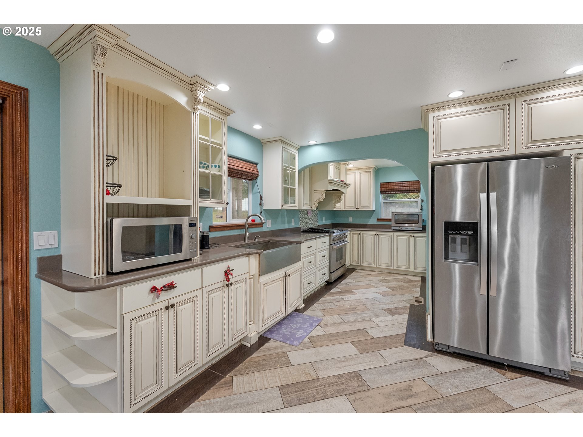 WOW! 1910 farmhouse transformed into a high-end custom beauty, with an 1888 sq ft shop and upstairs guest quarters. You do not want to miss this one! Thoughtfully reconstructed in 2017, blending modern craftsmanship with the character of the original 1910 farmhouse it was inspired by, resulting in a high-quality, 2,518 sq ft residence set on a fully fenced one-acre lot just outside Myrtle Creek, with quick access to I-5 and Roseburg. The main level features a large living room that opens seamlessly to a custom kitchen and dining nook. Stainless steel appliances, a gas range, custom cabinetry, and detailed tilework set the tone, while crown molding, solid-wood doors, and quality finishes carry throughout. A main-level bedroom and full bathroom with tile floors and a walk-in tiled shower offer flexibility to the floorplan. Upstairs includes three additional bedrooms, an office nook, and a beautifully finished guest bath with tile floors and a custom tiled shower. The primary suite stands out with double doors, a spacious bedroom, a private deck balcony, a large walk-in closet, and an ensuite bath featuring dual sinks and a walk-in tiled shower with dual shower heads. A full wraparound porch and patio extend the living space outdoors. The property also includes a substantial, fully insulated shop with ductless heating and cooling, a full bathroom with tile shower on both main and upstairs levels. Nearly 1,900 sq ft on the main level. Above the shop is a finished 768 sq ft guest or apartment space with a Jack-and-Jill bath. Plenty of parking, room for toys or a home business, plus an additional flat pad ready for future plans. Apple, cherry, fig, Asian pear, plum, and pear trees add to the setting. This is a rare blend of space, function, and craftsmanship in a small-town setting. Schedule your private tour of this one-of-a-kind home today!