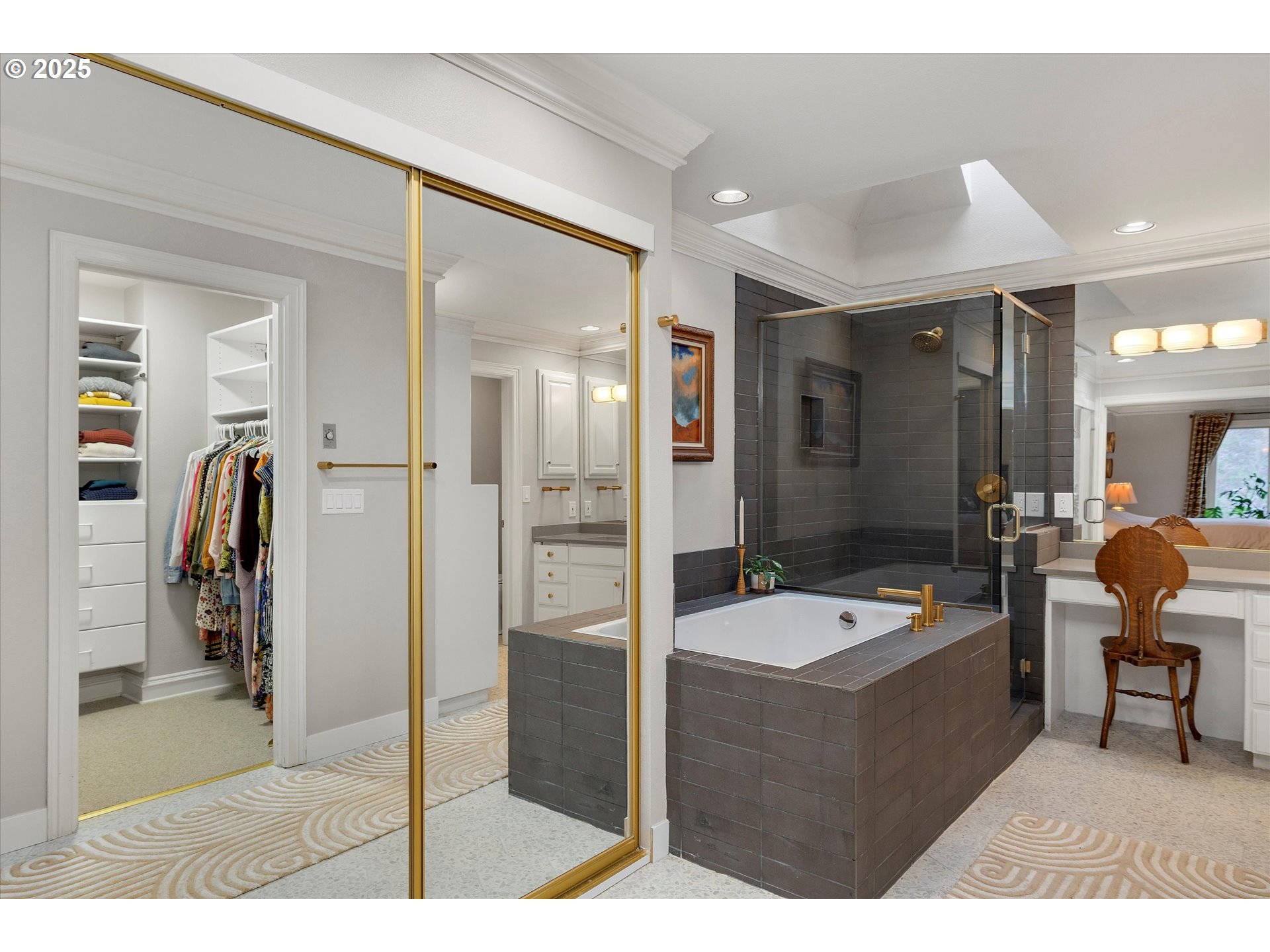 Discover your own private park in the heart of Lake Oswego’s coveted South Shore Estates neighborhood. Set on a sprawling .85-acre lot, this meticulously updated home offers a rare blend of serene privacy, modern luxury, and incredible lifestyle flexibility. The expansive backyard, complete with a sport court and covered patio, creates a secluded setting for year-round recreation and entertaining. The thoughtful floor plan is designed for modern living, featuring a sought-after owner’s suite on the main floor. This private retreat offers exceptional convenience with a full bathroom and walk-in closet, plus a separate half-bath that features a second walk-in closet and a tranquil infrared cedar sauna. The main level flows effortlessly, with rich hardwoods connecting the living and dining rooms, while the updated kitchen shines with a new gas stovetop, stainless steel appliances, and new pendant lighting. Upstairs, the home continues to impress with a second bedroom suite, perfect for guests or multi-generational living. Three additional bedrooms provide ample space, with one perfectly suited for a private home office or den. The home's unique spaces are what truly set it apart, including a versatile workout studio with cork floors and a skylight for yoga, plus a finished dance studio above the garage—offering endless possibilities for hobbies and passions. With over $250,000 invested in recent improvements, peace of mind comes standard. This extensive list includes a new architectural roof, new upstairs windows, a new furnace and A/C, an on-demand water heater, and an EV charger. The exterior and interior were repainted in 2021, and all bathrooms have been tastefully updated with new tile floors, quartz countertops, and custom glass showers. Located just minutes from top-rated Lake Oswego schools and the shores of Oswego Lake, this exceptional property delivers an unmatched living experience.