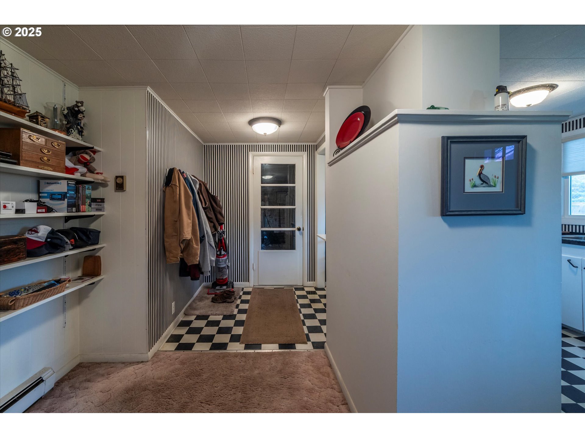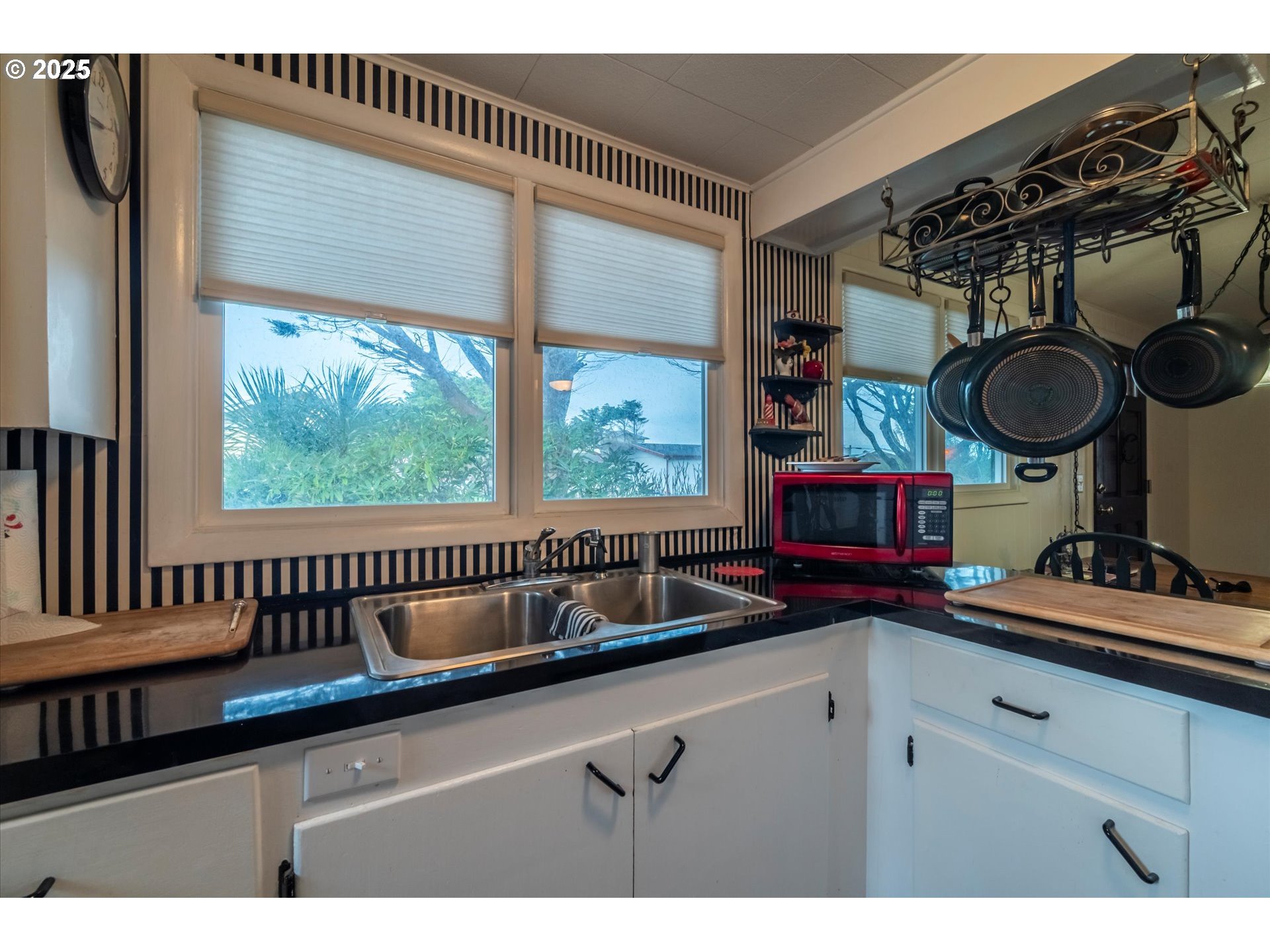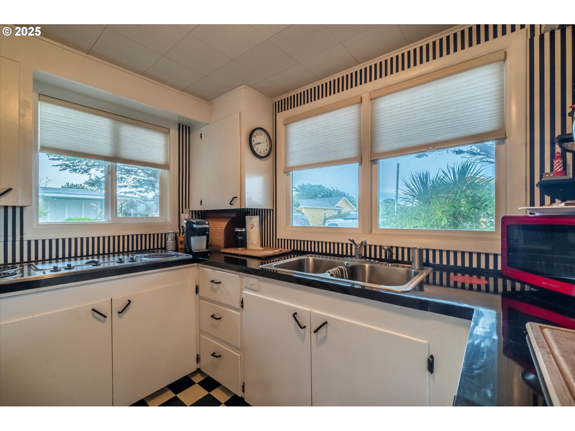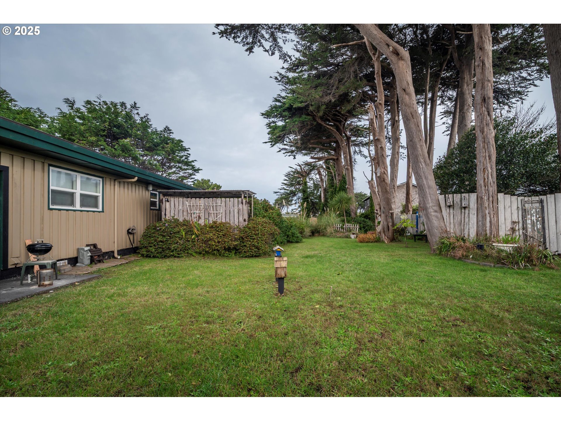 Charming vintage 2 bedroom, 1 bath 1954 built home with 984 sq ft on a generous .23ac lot in Bandon, Oregon. This sweet single level house offers a spacious living room with a classic brick fireplace surround and insert, perfect for warming up after a day at the beach. The kitchen keeps its retro character with checkerboard flooring, eating area and living spaces feel comfortably connected. One bedroom has a sliding glass door leading to a private deck, creating an easy indoor outdoor retreat for morning coffee or quiet evenings. Outside, lush, mature landscape wraps the home in greenery. The oversized one car garage includes storage space, laundry area, and convenient access to the backyard. An additional outbuilding with a sunroom style sitting area offers flexible space for hobbies, storage or a studio. Located a short distance from Old Town’s charming shops and restaurants and the stunning beaches that make this coastal community so special.