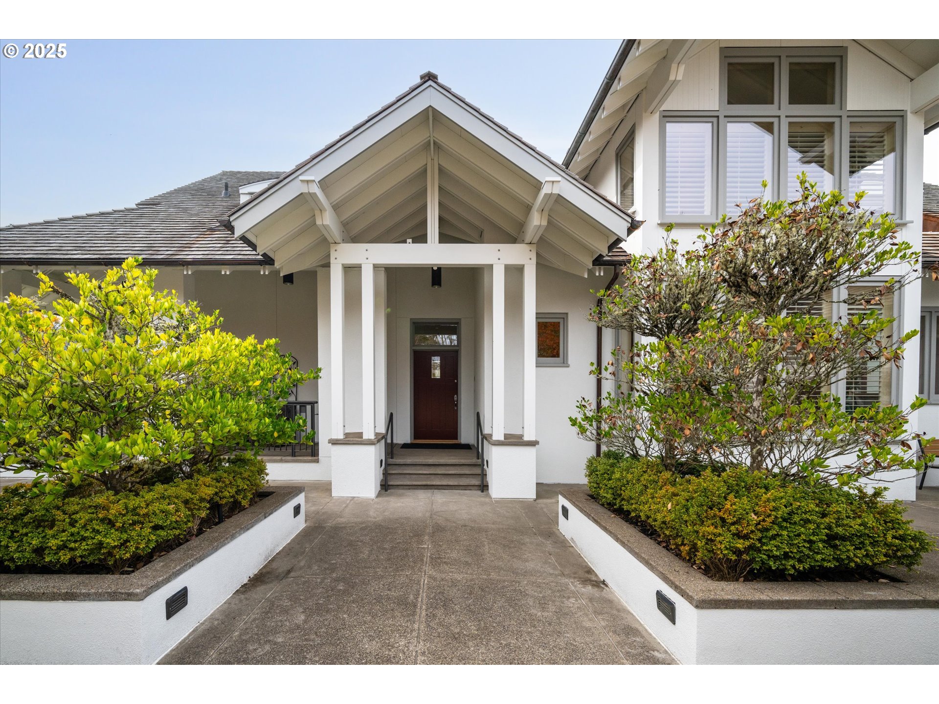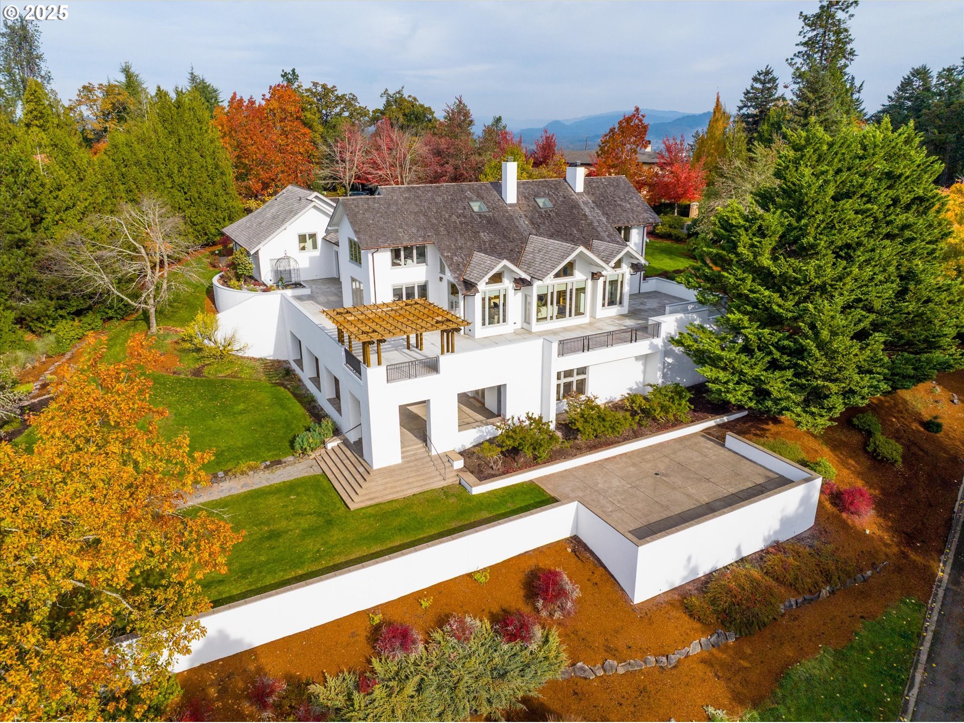 Your High Level One-of-a kind Estate is here! Wrap around covered concrete front entry porch welcomes you into your Spacious & Airy open floor plan with wide hallways & rooms offering vaulted beamed ceilings enhancing the home's sense of grandeur & flow. Multiple large doors & windows offer abundant natural light & views connecting the main living spaces to outdoor patios,verandas, pergulas, landscaping vistas & views! Flooring throughout the main level consists of warm wood keeping the interior cool & grounded. Living room adjoins Library & Formal Dining offering wood beam ceiling rafters & skylights.The Gourmet kitchen offers built in Refrigerator, SS appliances,Miele dishwasher,sizeable Pantry,custom cabinetry,built ins & Plumbed-in restaurant-quality expresso machine! Designated Den on main level with full Suite & walk in closet could easily accommodate a main level Bedroom Suite. Upper level hosts Beautiful Vaulted Primary Suite with Sitting area & FP, walk-in closet & considerable windows showcasing views! Two additional bedrooms, each with private bath on upper level with office nook. Lower level offers incredible opportunities of multiple Jumbo rooms,Entertainment or Game rooms,additional bedrooms offering multiple accesses to lower wrap around covered patio & landscape. Conveniently located Wine Cellar possibilities. Property includes TWO TAX LOTS totaling 2.02 acres. Professional Landscaping offers Patios/pergula, veranda w/ arbor,Built-in planting stations, Extensive rock fountain waterfall system & stream style water feature with Japanese-style design & foot bridge. Spacious lawn area with outdoor lighting systems & 2 irrigation systems to facilitate.Heated 3 car OS garage w/ shop with 220 & room for storage/Potters Den? FULLY FURNISHED ADU w/ skylites above garage offers Kitchen, living rm, bedroom,closet & full suite.This is the home you have been looking for offering possibilites for YOUR family. Adjoining lot of 1 acre included in sale!