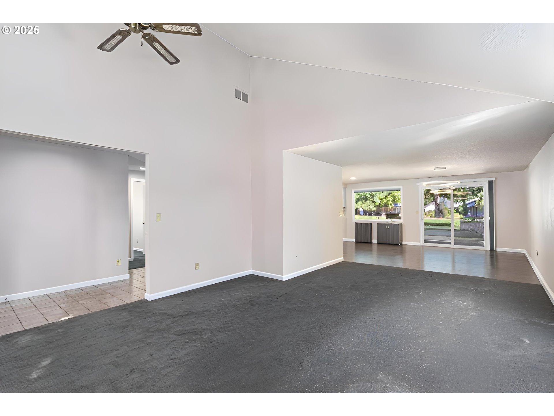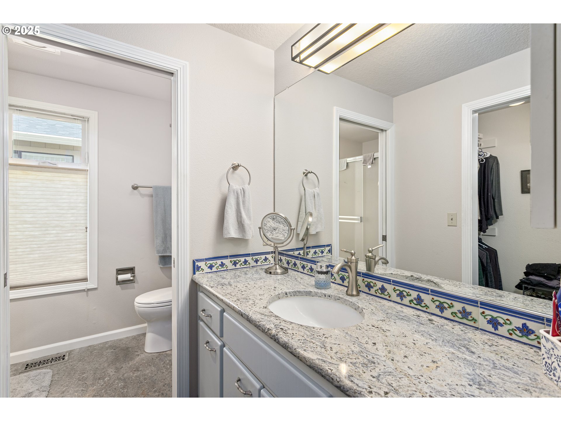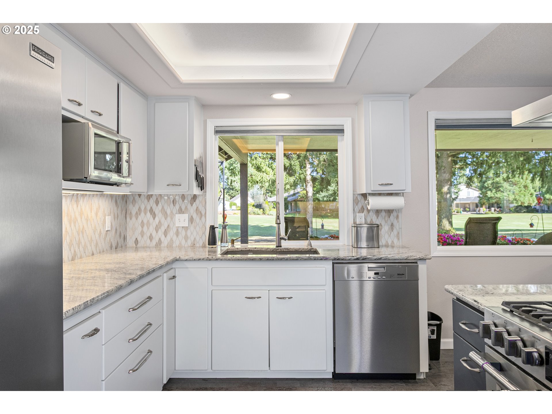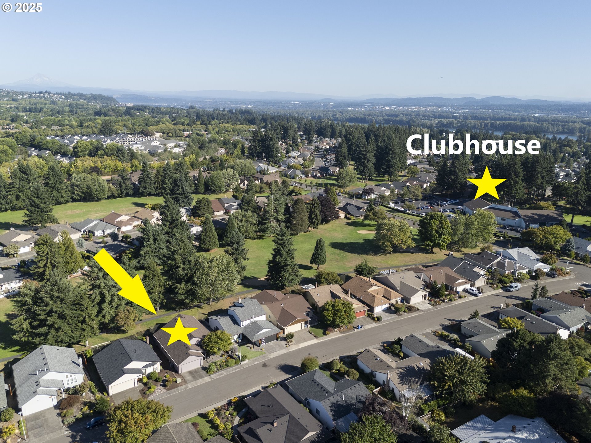 It's challenging to find a smaller house on the golf course with spectacular views and the clubhouse nearby. This popular Salishan model features a wall removal from the original plan, creating an open concept and an amazing, large designer island kitchen with a picture window overlooking the fairway. The kitchen features large drawers, roll-out shelves, a cabinet pantry, and an appliance shelf, as well as a Composite sink, Granite Counters, and a designer Hood, all of which are designed with many modern conveniences in mind. Relax in the front outdoor seating area to enjoy your favorite beverage and take in the sunsets. Imagine your morning cup of coffee on your covered patio overlooking the fairway. Enjoy those gloomy days or hot days under your large covered patio all year long! Vaulted ceilings as you enter this floor plan, with tall windows bringing abundant lighting. The wall removal provides a spacious, open setting. Enjoy the updates, including replaced windows, a new roof installed two years ago, composite decking, cork kitchen flooring, and new kitchen and bath countertops. A well-maintained and low-maintenance home is a must-see for your tours here in the village. A vibrant 55+ planned community featuring a clubhouse, a variety of scheduled activities, exercise facilities, a sauna, a swimming pool, billiards, ping-pong, an arts and crafts studio, a ballroom, a library, meeting and event rooms, and much more!